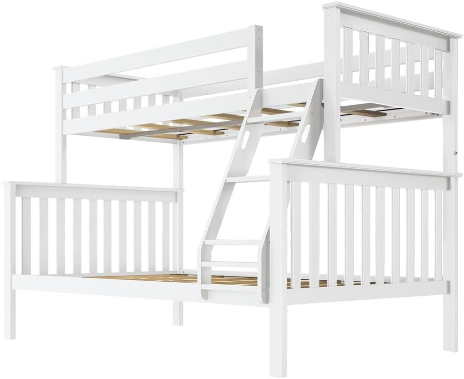 Plenty of room for sleep and play? Now thats a win-win! The Twin Over Full Bunk Bed is the perfect combination of functional and fun that both kids and parents love. Top bunk features tall 14 guardrails, so the bed safely fits standard mattress sizes. Angled ladder with rounded edges offers comfortable, easy climbing. Added bonus - ladder is both reversible and removable, so it is flexible to work with any space. Solid, knot-free New Zealand pine wood adds strength and stability. All products use a durable, low VOC finish. The slatted head and footboards and flush, color-matched hardware give this bunk bed a clean, modern look. Instructions, upper/lower slat rolls, and required hardware are included. With solid plywood slats and a metal support bar for the top bunk, each sleeping surface can support 400 pounds of resting weight. This bed meets or exceeds Federal safety standards for kids furniture. When its time for play, this bunk beds space saving design frees up plenty of floor space by stacking two sleeping surfaces. 2+ adults make assembly simple and easy. The Twin Over Full Bunk Bed from offers exceptional quality and affordability that kids and their parents will enjoy for years to come. is a member of the Maxwood family of brands - the kids furniture experts bringing a tradition of superior quality, safety and fun!