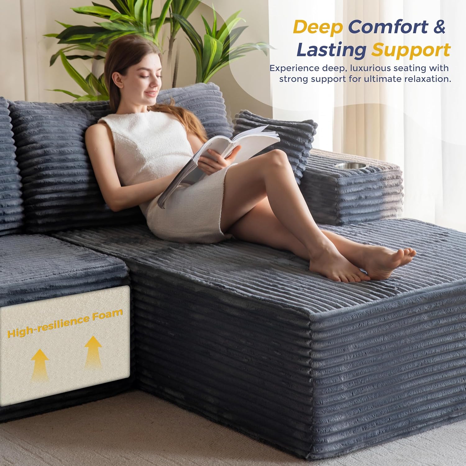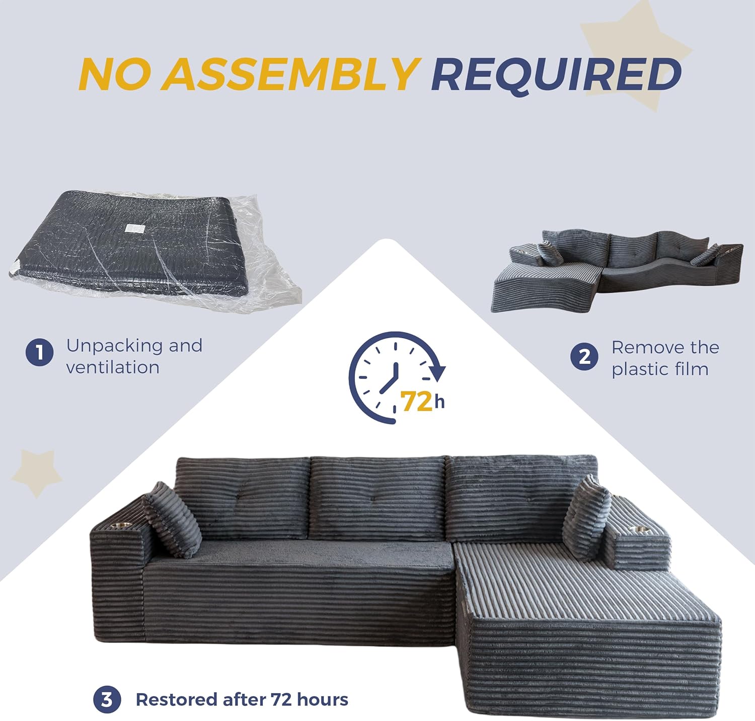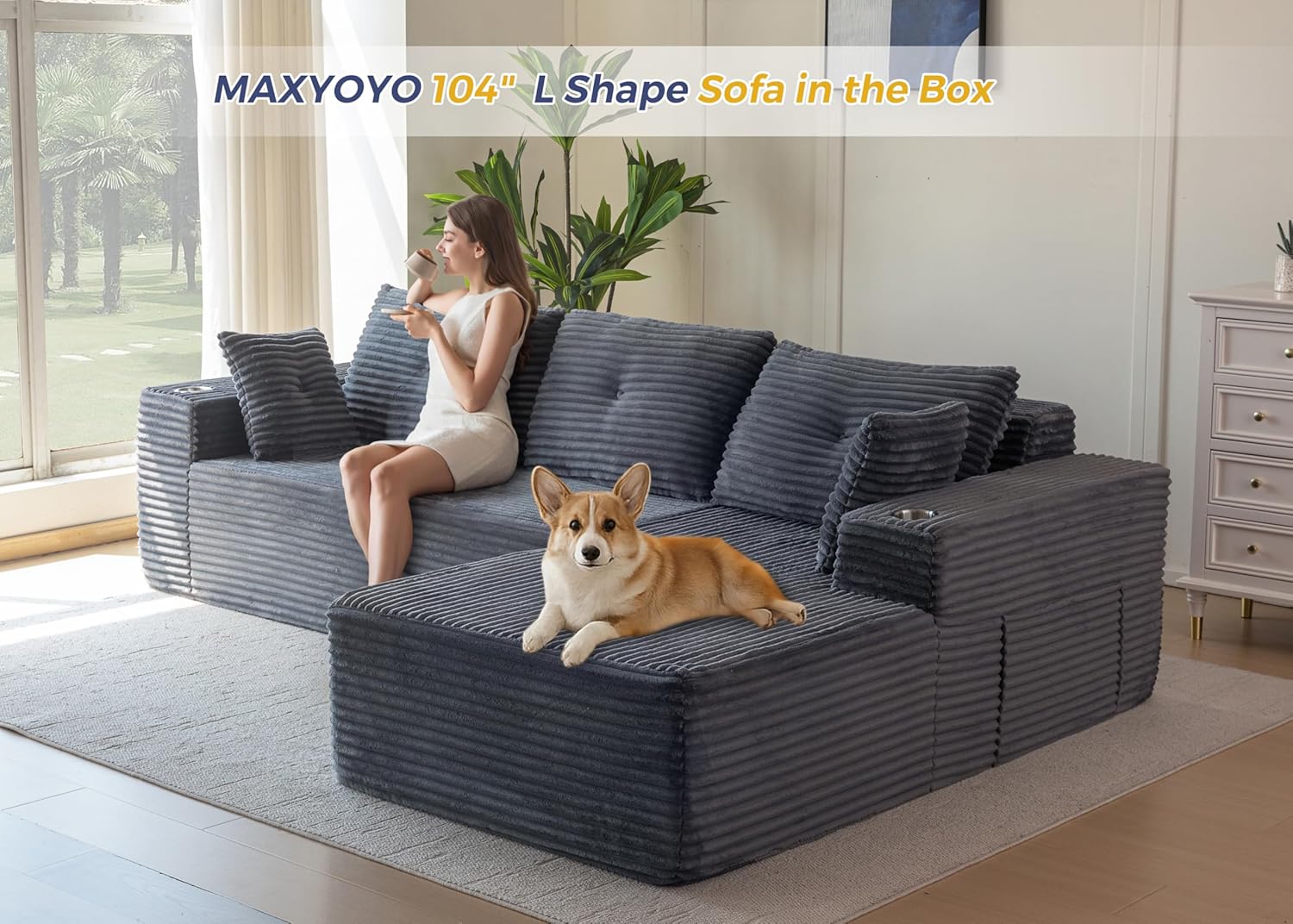 • 104" Modular Sectional Couch with L-Shape Chaise, Modern Boneless Couch for Living Room, Sofa in A Box, Oversized Sofa Sleeper with Deep Seat, No Assembly Required, Dark Grey