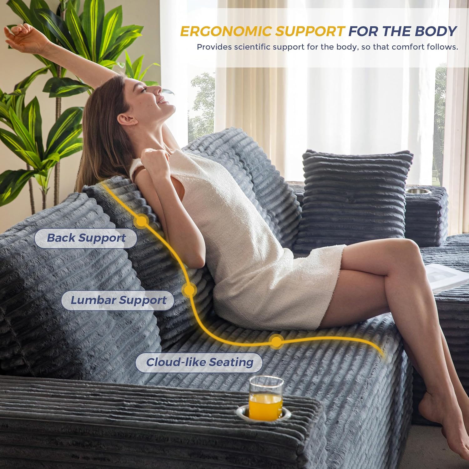 Oversized Sectional Sofa: The total width of the boneless sofa is 104 inches, which means unlimited possibilities of luxurious space for family movie watching, gathering with friends, or spending time alone, and the size of the L-shaped section allows for a natural stretching of the legs to be transformed into a sofa bed for an afternoon nap