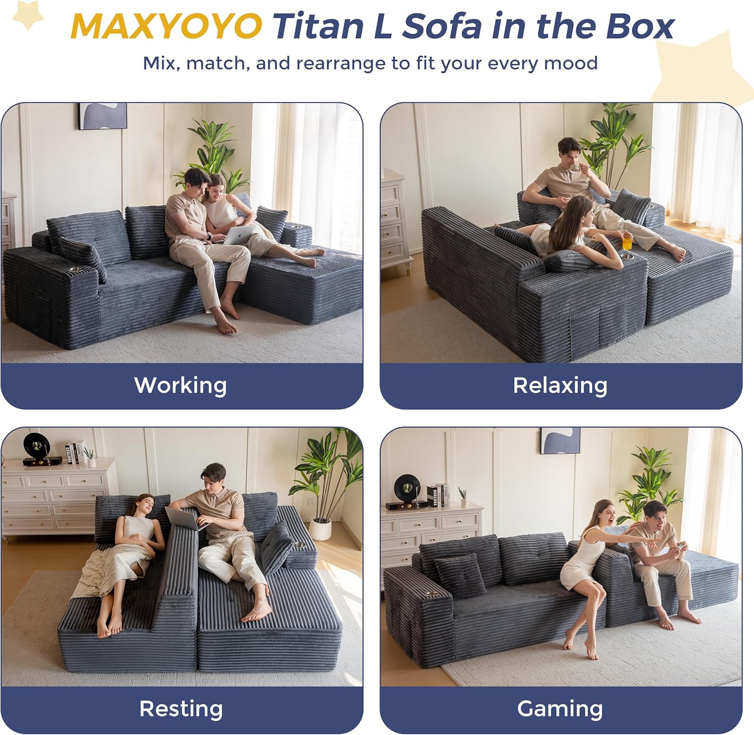 Modular Titan L Sofa Couch: The Modular Titan L Sofa Couch adopts modular splicing structure. Each module is individually moulded and can be split or combined at will, making it easy to cope with changes in space. Whether it's a compact flat or an open-plan living room, the layout can be adapted to utilise the space, which is convenient for you to read books, play games, watch TV and other leisure activities