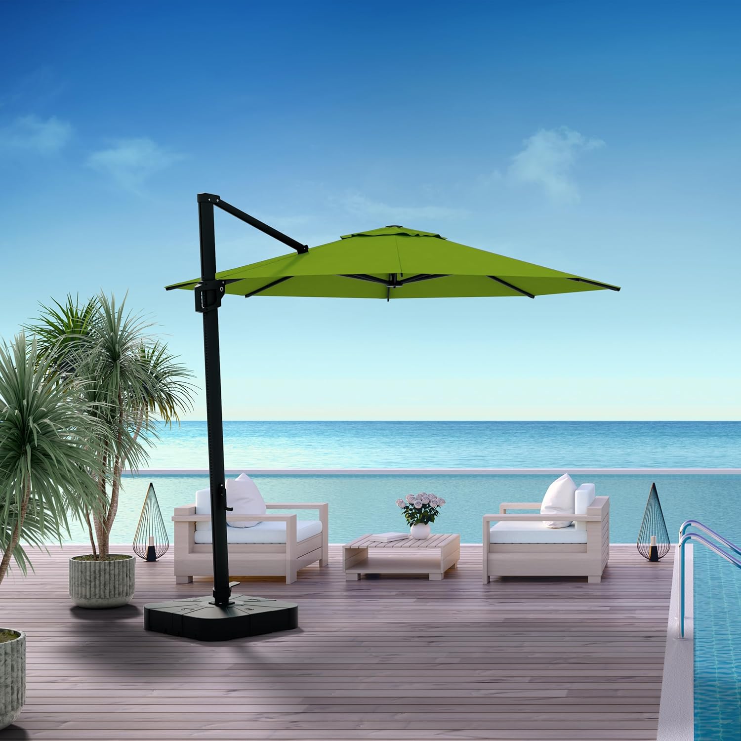 • 10 Ft Outdoor Cantilever Patio Umbrella w/Terylast Pear Green Fabric - Rotate Tilt 360 Offset Patio Umbrella, Deck Patio Umbrella, Backyard Umbrella & Garden Umbrella - Black Frame