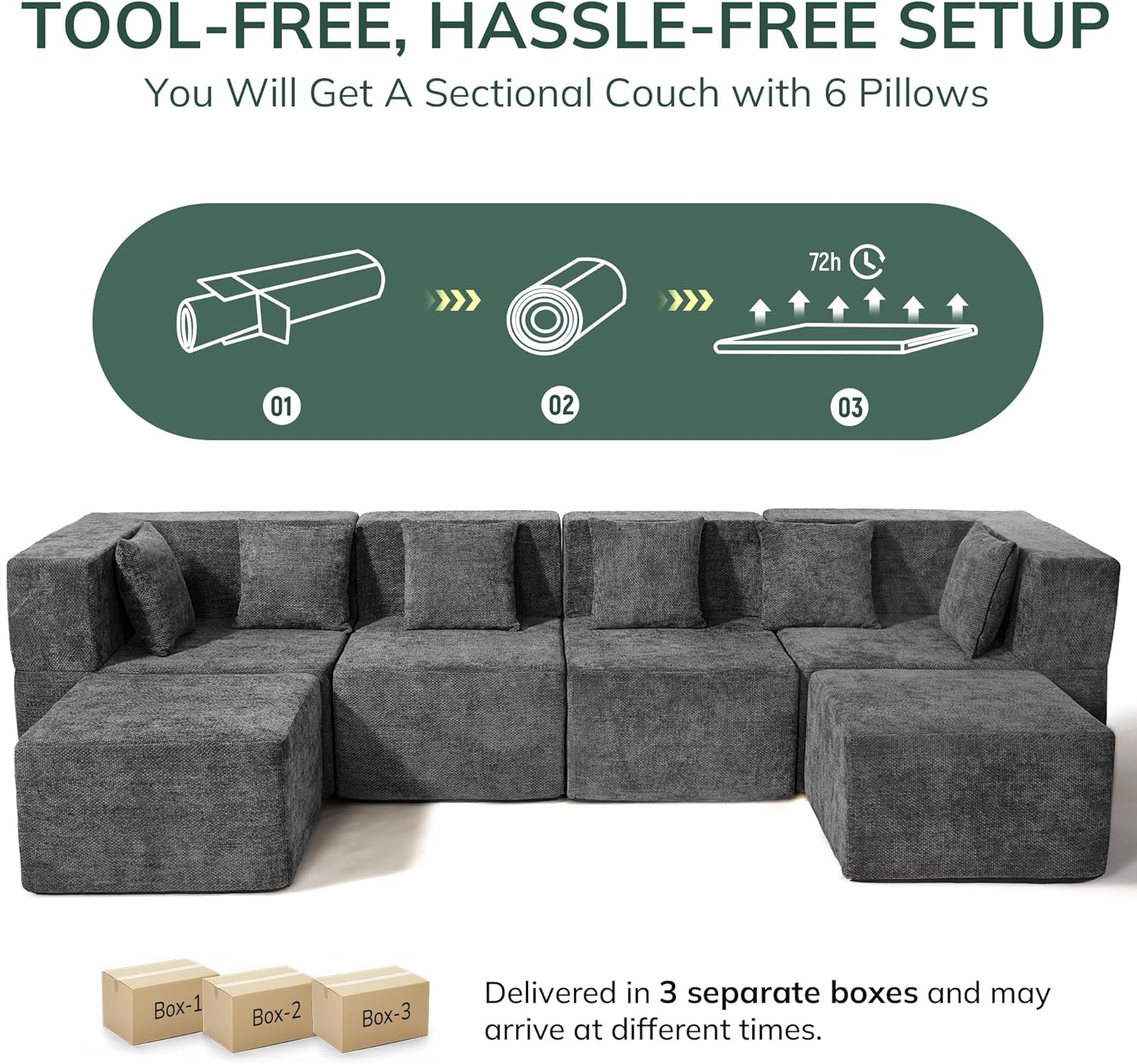 Multifunctional Use, Modular Design - This compression sofa set consists of 6 small modular sofas, which greatly improves its flexibility. Not only can it be easily moved and reconfigured, suitable for various places such as living rooms, bedrooms or apartments, but its splicing function makes it no longer just an ordinary sofa, it can also be transformed into a comfortable sleeper sofa to provide additional sleeping space. Not only practical, but also beautiful and generous, how attractive!