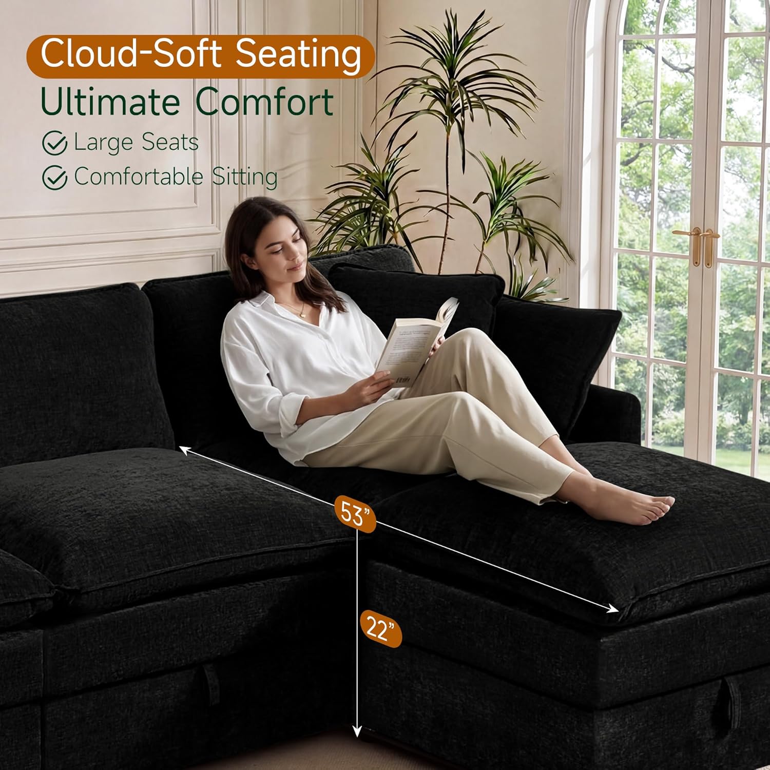 Enhance Your Living Space: Optimize your small living room with this versatile storage sofa. Its cloud-like dual-layer cushions provide ultimate comfort, while the spacious hidden compartments keep clutter out of sight for a sleek, organized look