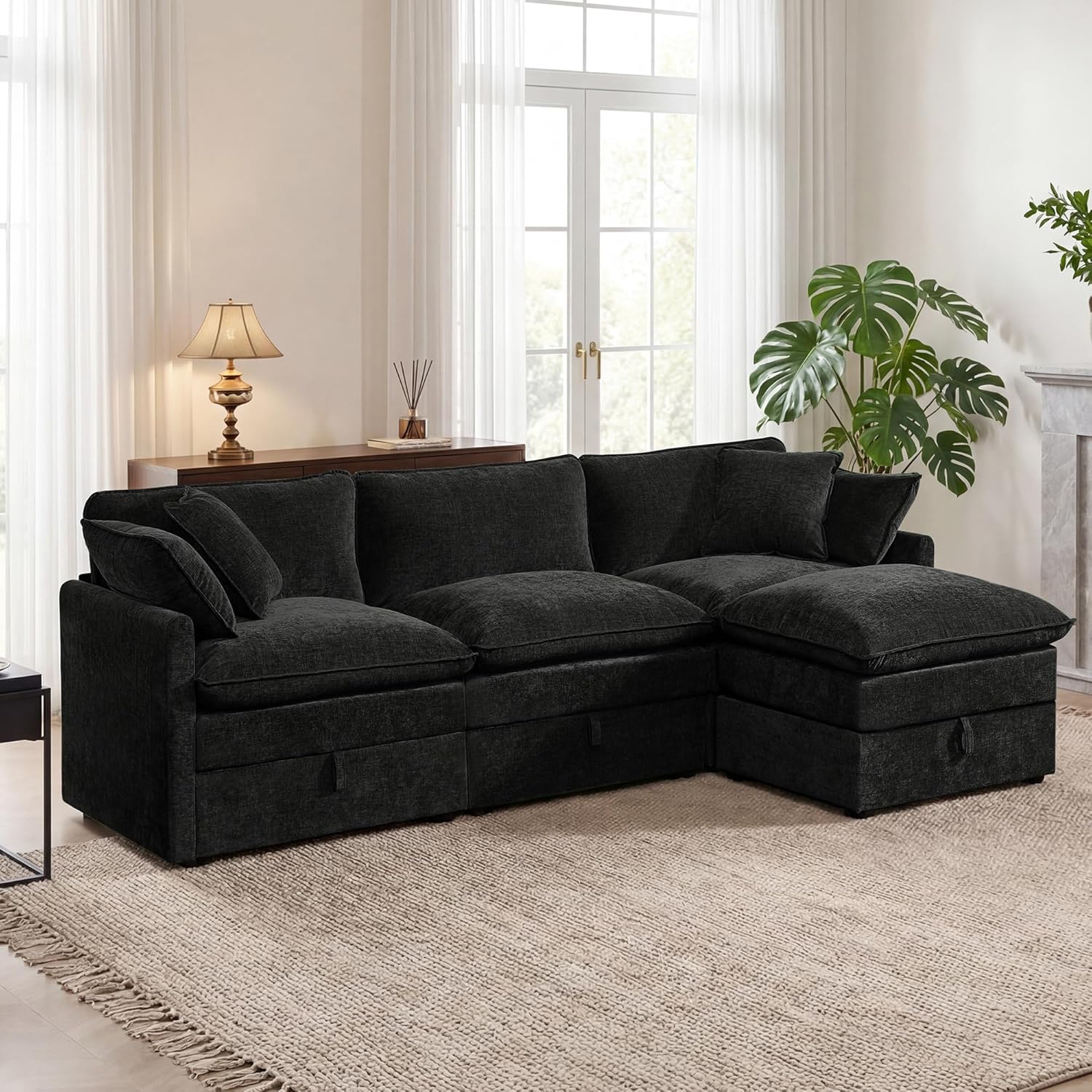 • Modular Sofa with Storage, 103" L Shape Sectional Cloud Couch, Comfy Fabric Couch with Movable Ottoman, 4 Seat Modern Deep Seat Sofa for Living Room (Black Chenille)