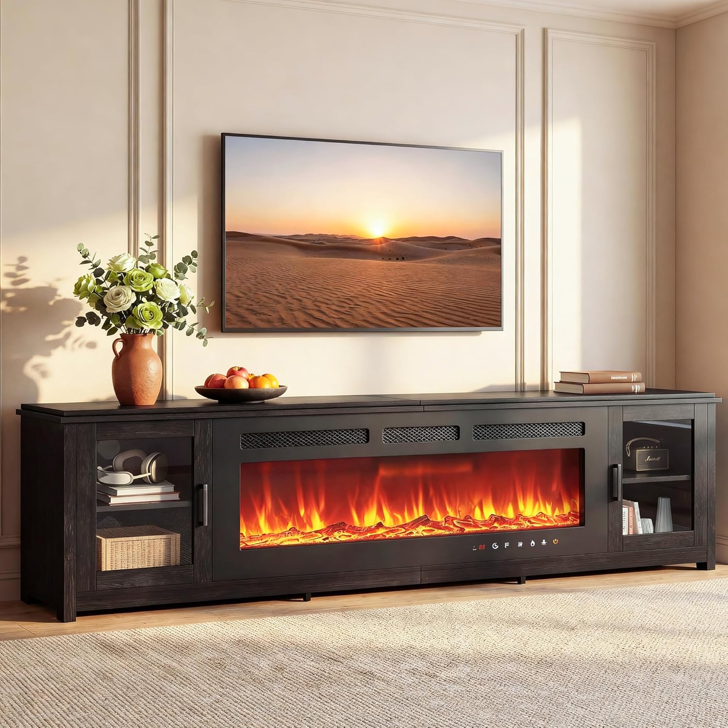 Sturdy, Warp-Resistant Build: Crafted from high-density particleboard and finished on both sides with textured black melamine, this TV stand resists warping and maintains its sleek look. Realistic carbon logs and crystal stones enhance the authentic flame effect. Its robust construction safely supports up to 132 lbs (60 kg) of weight