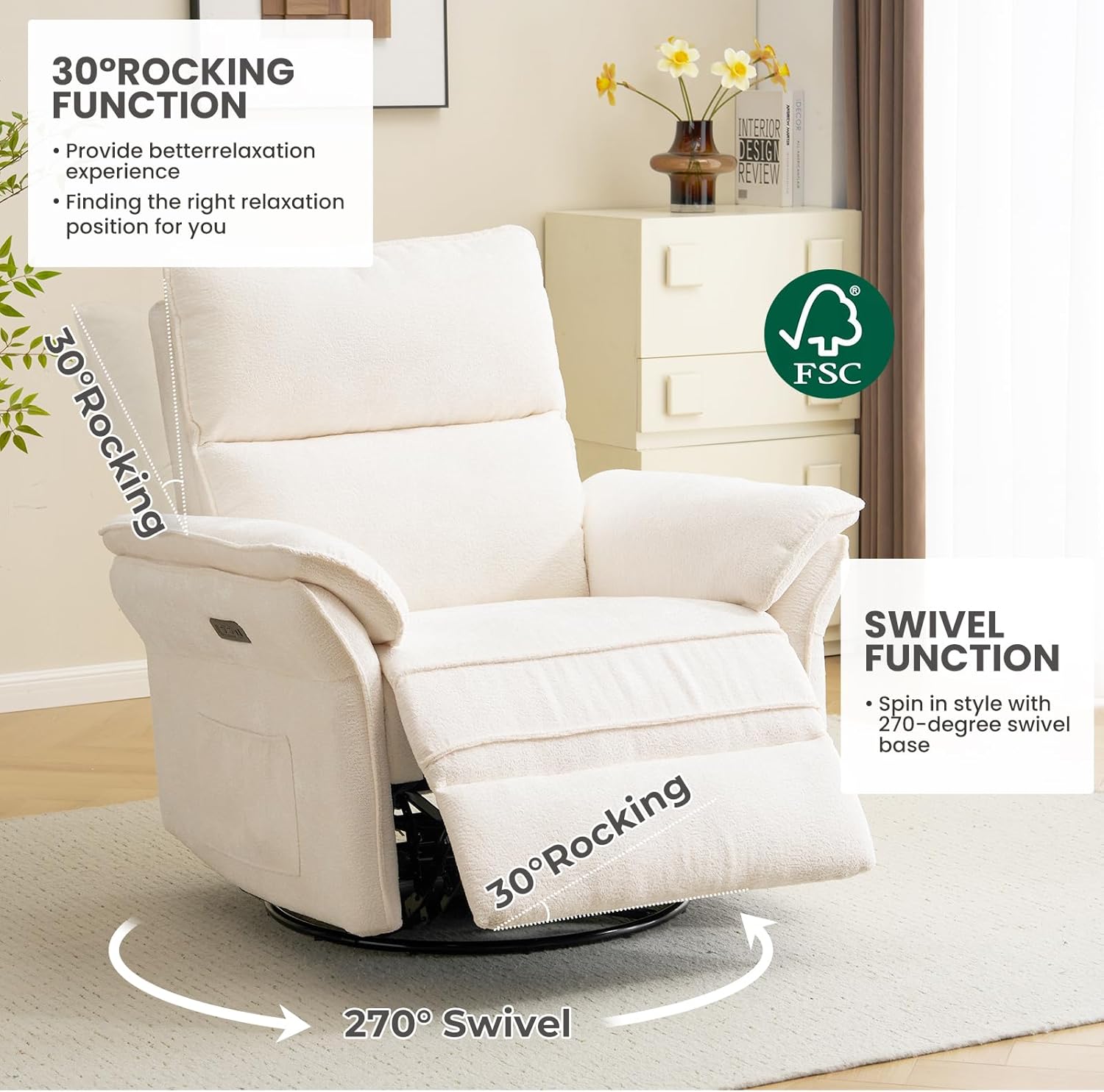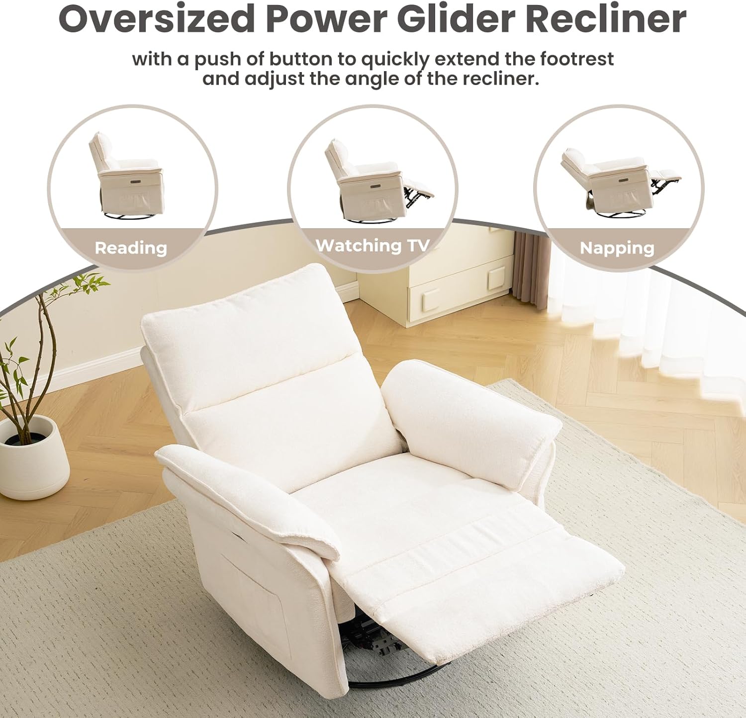 Oversized Swivel Rocker Recliner : Product Size: 38.5"D x 34"W x 41"H, Seat Size: 26"W x 21.5"D, Weight Capacity: 350 lbs. This glider rocking chair offers a reclining angle of 90-135, Simply press the button lightly to relax, read, and sleep. It also features a 270 swivel and 30 rocking, it provides maximum comfort and convenience whether you're relaxing or soothing your baby to sleep. Metal base and solid wood construction for durability.