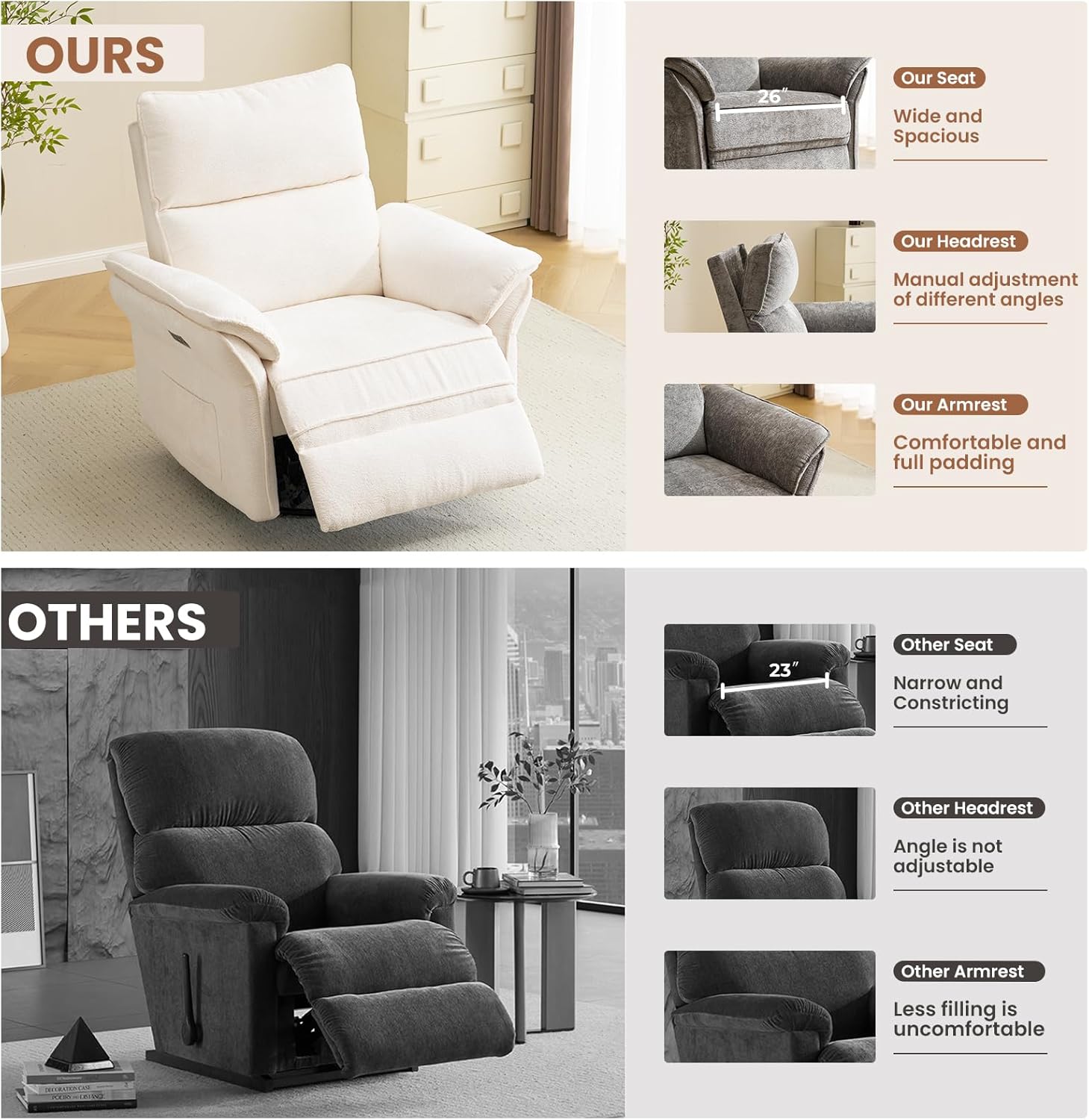 Adjustable Headrest: The headrest of this glider recliner nursery chair can be manually adjusted to a variety of angles, and the recliner chair is comfortable design helps reduce pressure on the neck and shoulders, providing comfortable support and making it easy to adjust to a comfortable position for you.allowing you to watch TV or lean back without straining your neck or head, for personalized comfort.