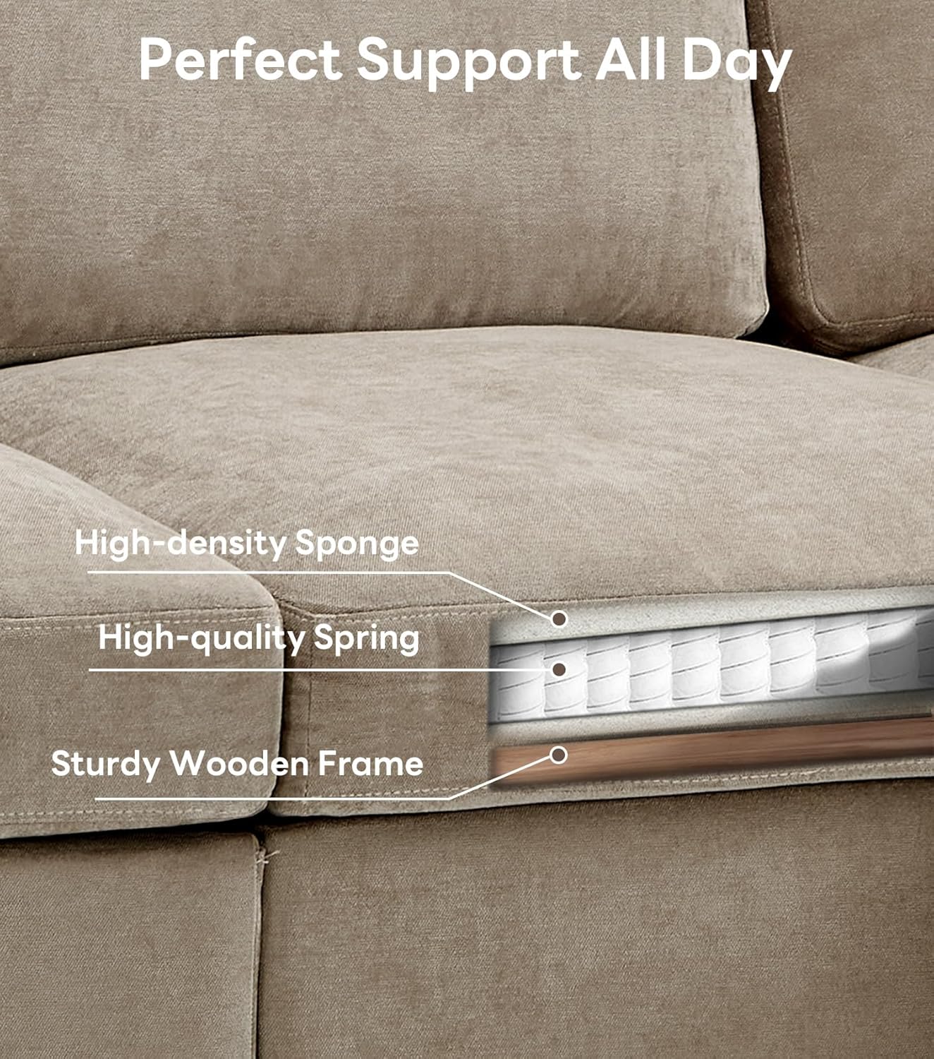 HR Foam + Spring System Never Sags: Dual-layer seat construction: high-resilience foam core + pocket spring system. Springs provide deep-down support; HR foam instantly reboundsno more "sitting in a hole." Tested to withstand 50,000+ compression cycles without losing shape. You sink in softly, but stand up easily