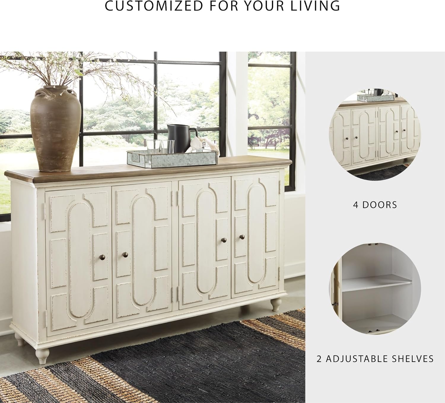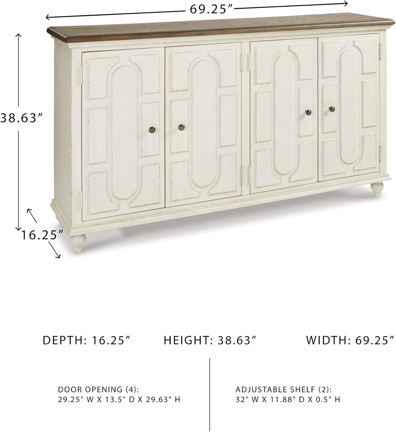 TWO-TONE FURNITURE DESIGN: Wonderfully timeworn in antique white, this 4-door cabinet with 2 adjustable shelves, is topped with a warm brown finish for two-tone interest
