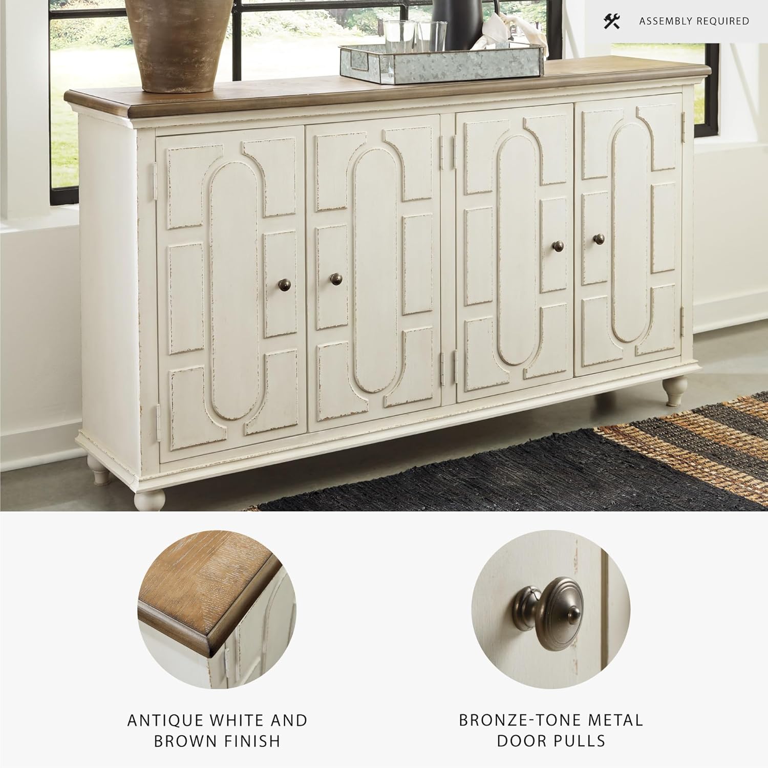 Bring character and functionality to your space with the Roranville Accent Cabinet. Whether your home leans cottage chic, boho inspired or eclectic, this versatile storage cabinet blends seamlessly with a variety of decor styles. Its standout design features raised panel door fronts that feel like handcrafted art, finished in a beautifully distressed antique white for a timeworn look. A contrasting warm brown top adds two-tone charm, making this piece a stylish focal point for any living room, entryway or dining area. Behind four doors, two adjustable shelves provide flexible storage for everything from dinnerware to board games, helping you keep clutter out of sight. Bronze-tone metal door pulls complete the vintage-inspired aesthetic. Crafted from veneer, wood and engineered wood for durability, this accent cabinet offers both beauty and practicality. Assembly required.