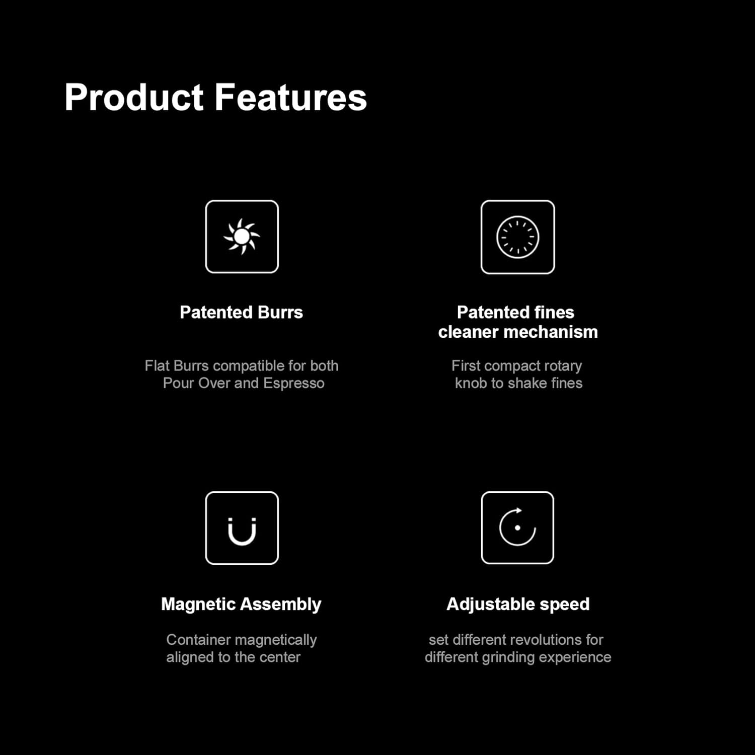 [ Adjustable 800-1200 RPM ] Fine-tune your brew, and achieve your desired flavor withadiustable RPM. lt's available to set different revolutions togive you different grinding styles so you can have a varietyof operations according to your preferences.
