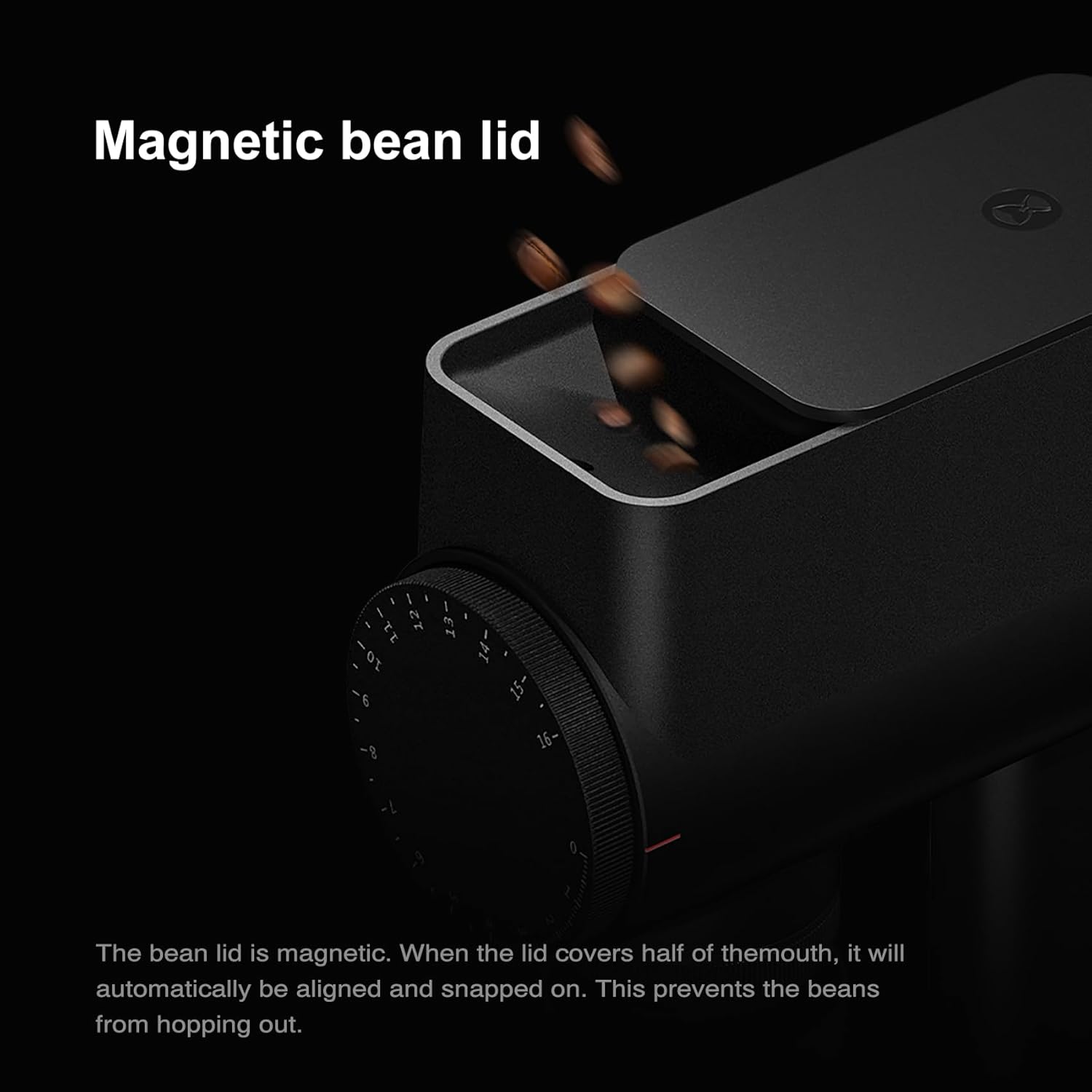 [ Magnetic Alignment Container ] The magnetic lid ensures a snug fit when covering the bean entrance, Just place it on the base and the container will get alignedautomatically to the center smoothly and accurately. Experi-ence the magic of magnetically aligned containers for yourcoffee beans.