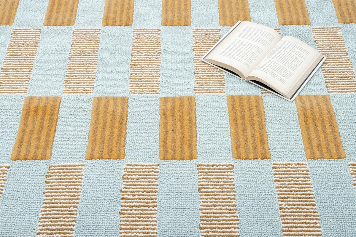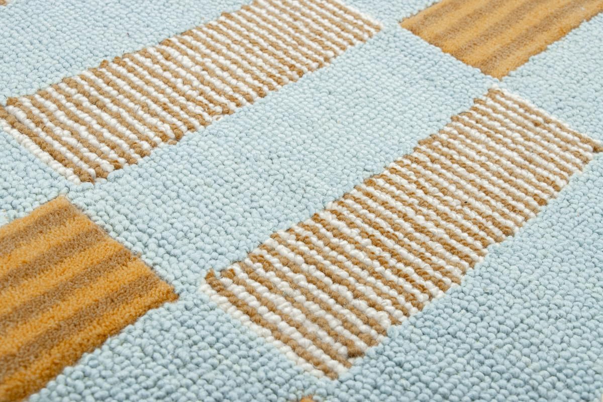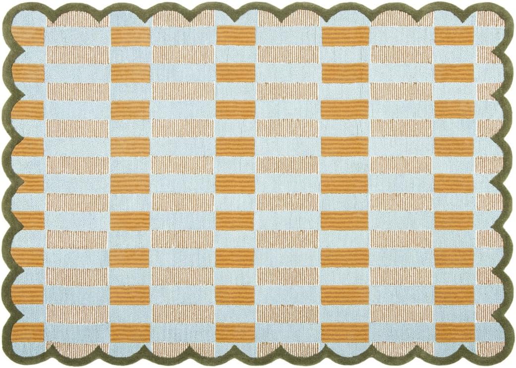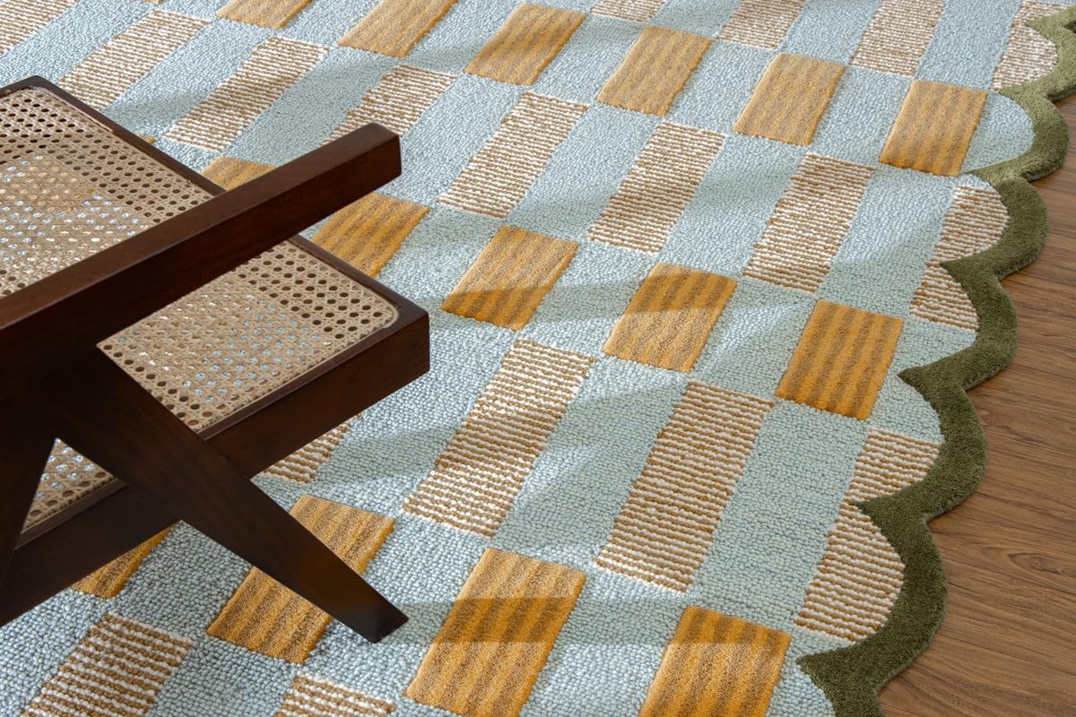 • Checkered Hand-Tufted 100% Wool Area Rug - 5x8 Ft, Rectangular Light Blue Base with Mustard and Beige Blocks, Olive Green Scalloped Edge, Cotton Backing Plush Carpet for Bedroom & Nursery