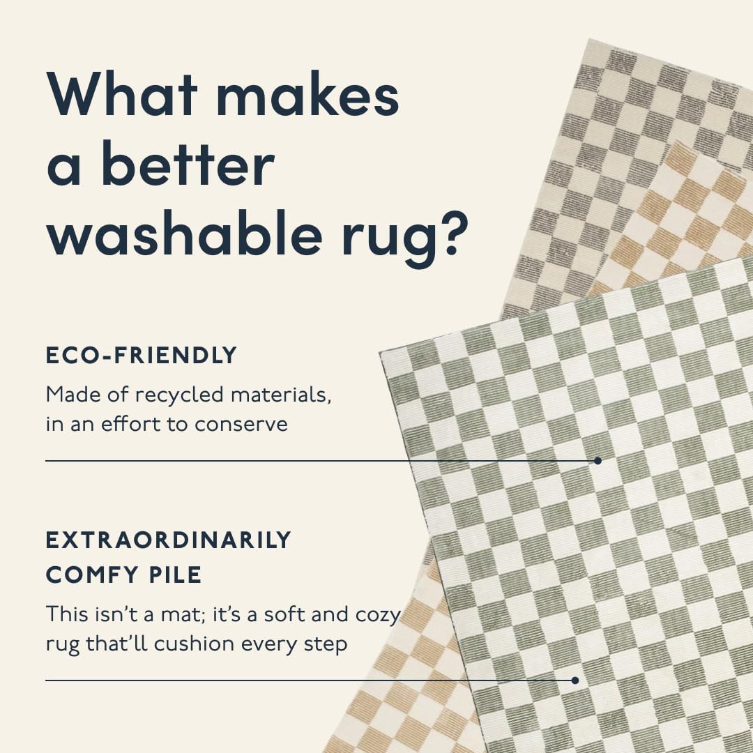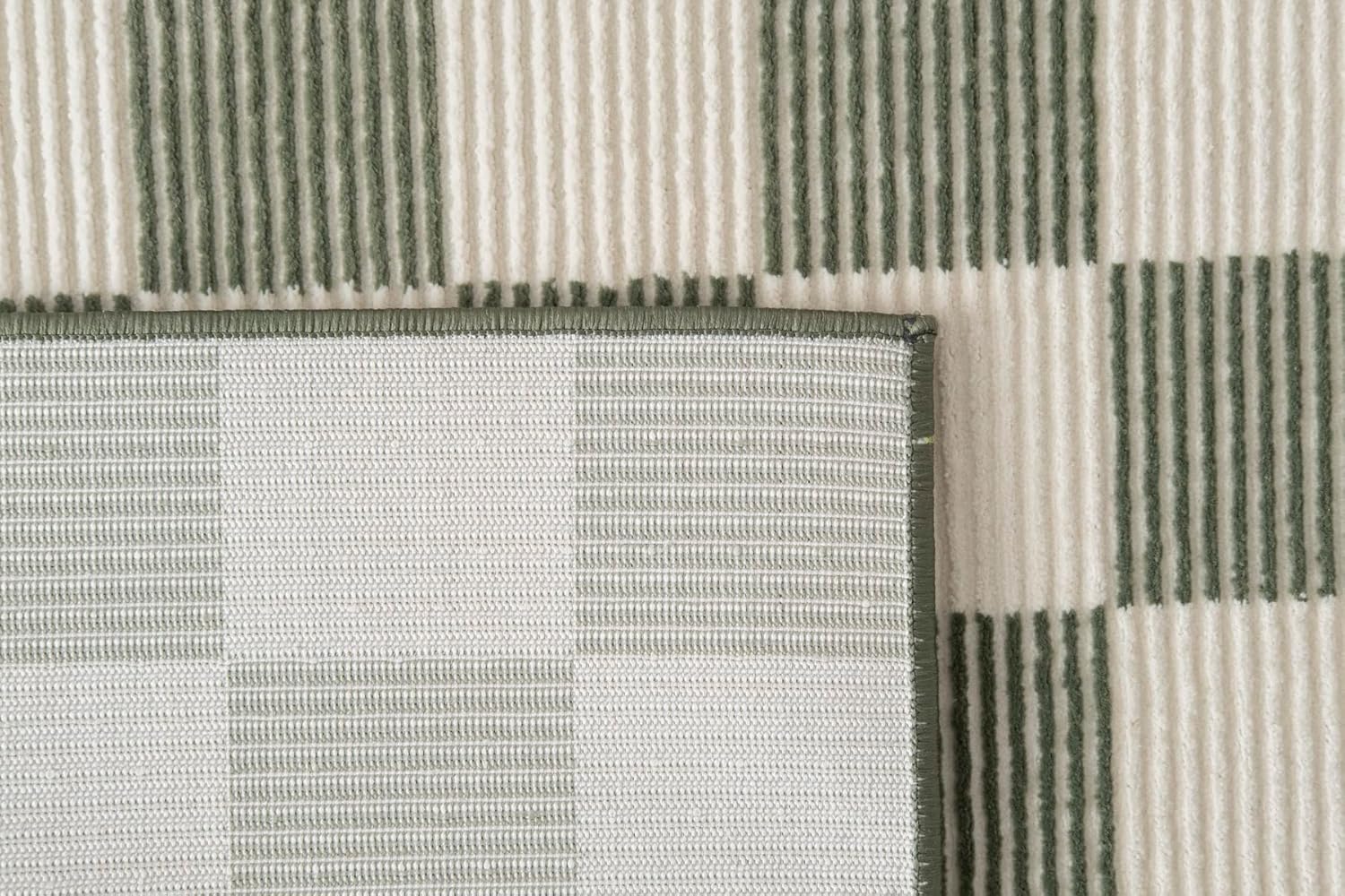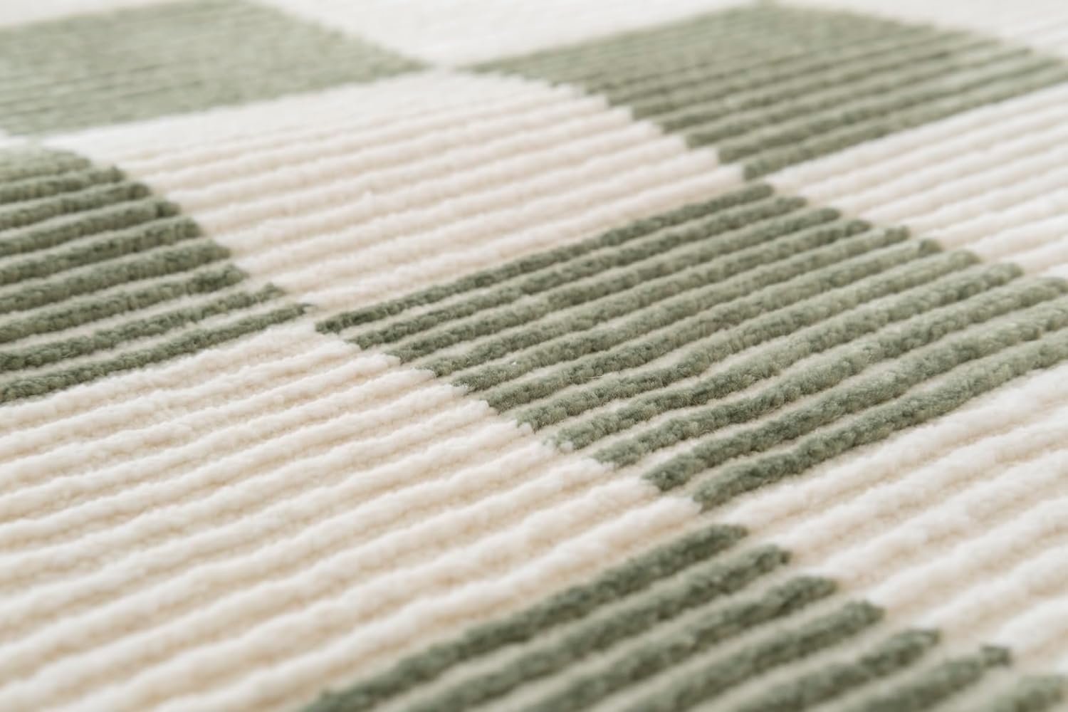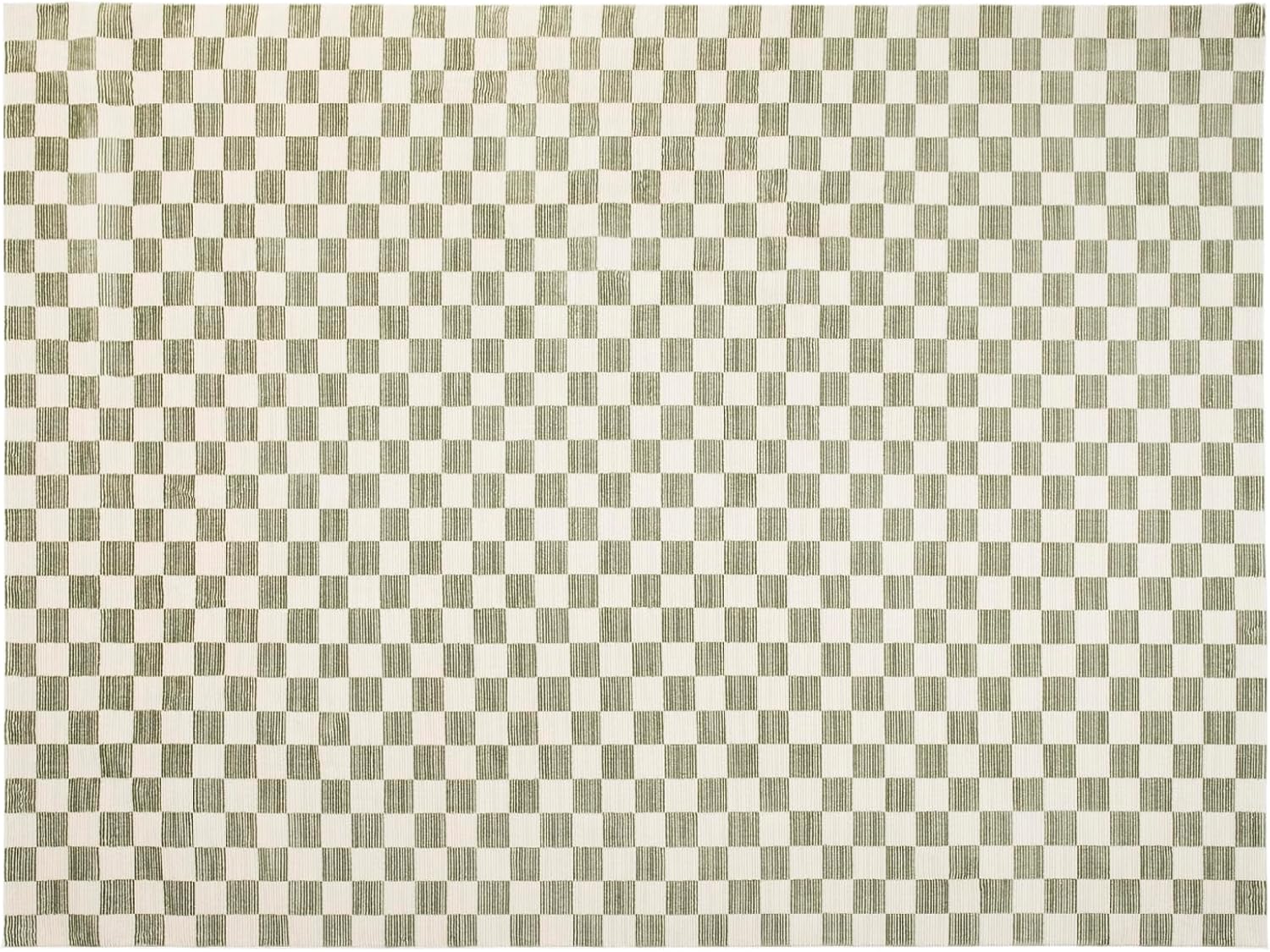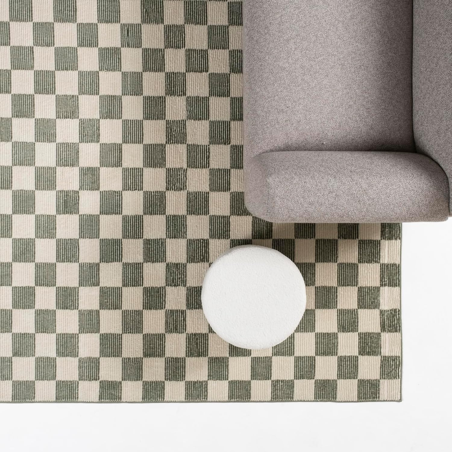 GAMBIT AREA RUG: For our green Gambit rug, soft cream is juxtaposed with olive green in a cheeky classic check pattern