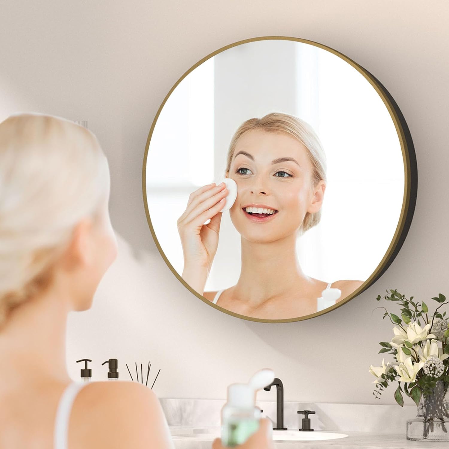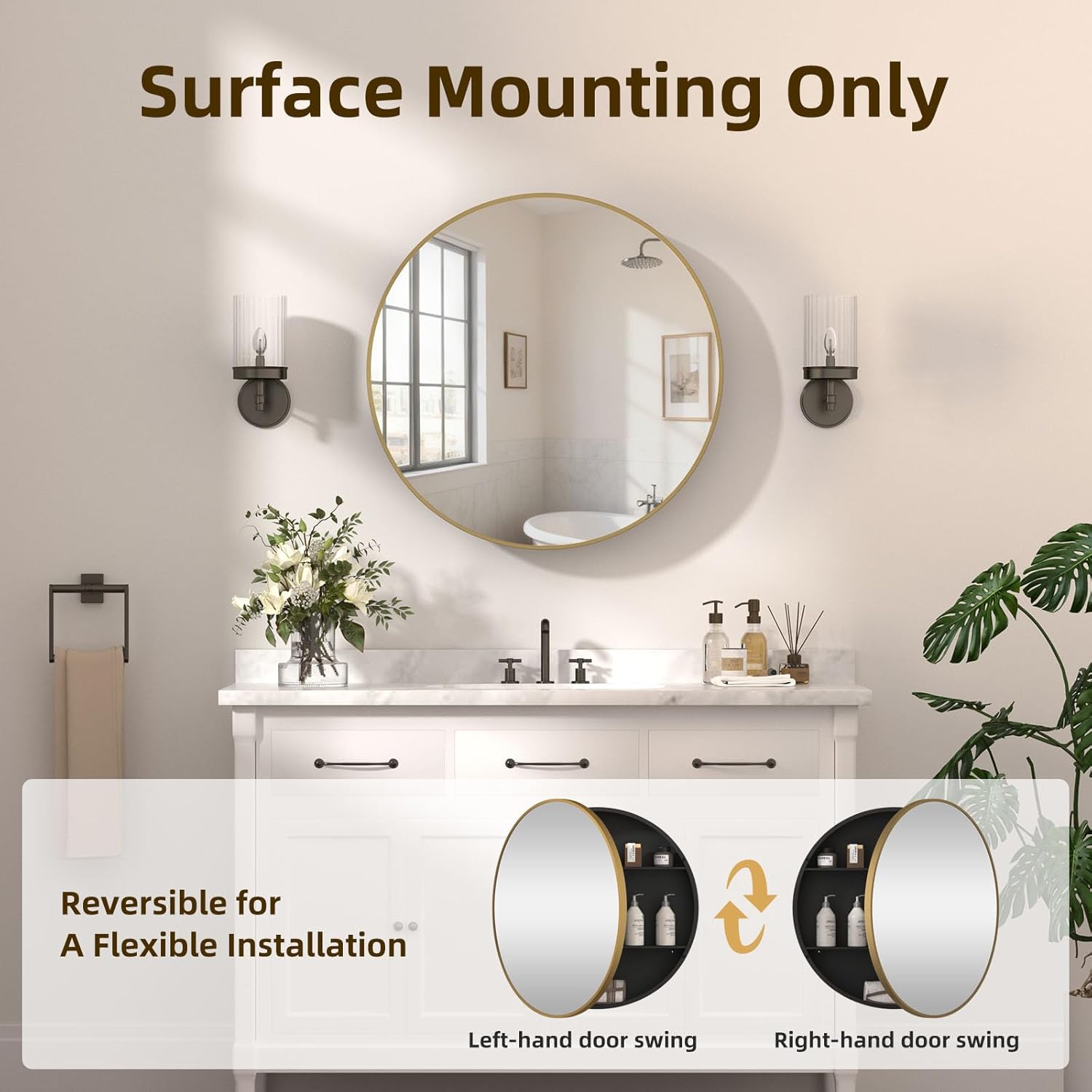 • 30 x 30 in Round Gold Mirror Medicine Cabinet Surface Mounted Circular Modern Bathroom Medicine Cabinet with Mirror Metal Framed Medicine Cabinets with Tempered Glass Mirror