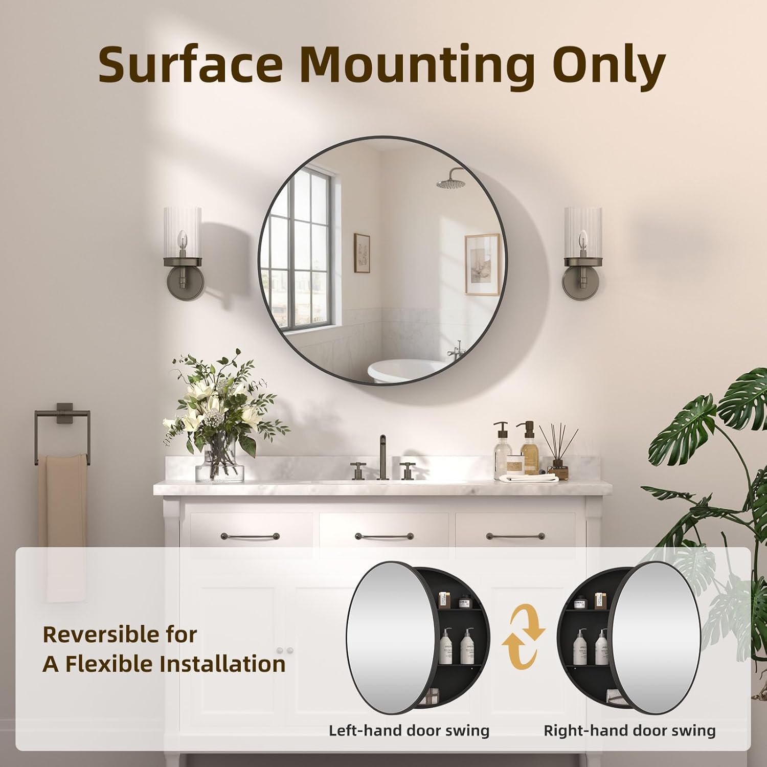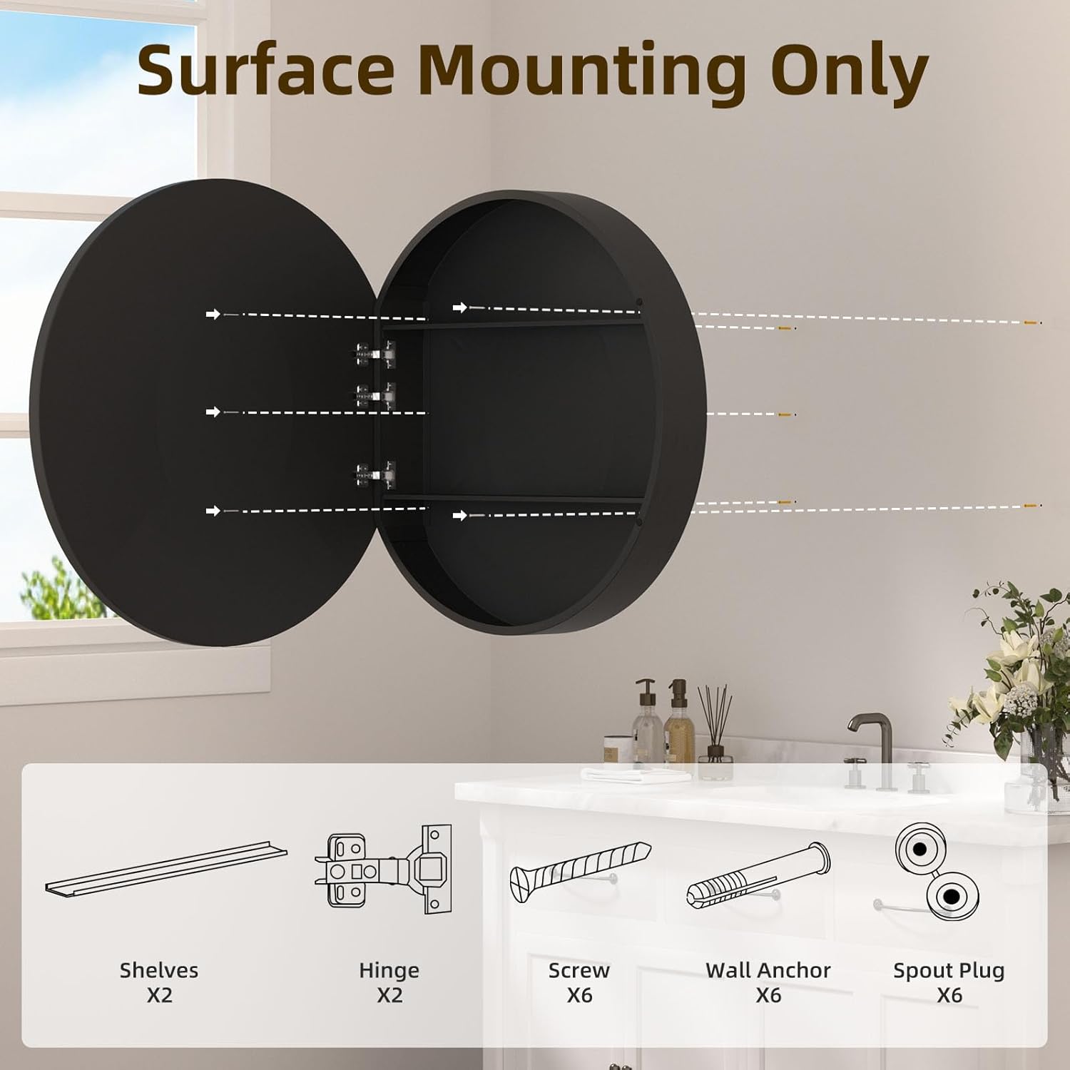 【𝐄𝐚𝐬𝐲 & 𝐒𝐞𝐜𝐮𝐫𝐞 𝐒𝐮𝐫𝐟𝐚𝐜𝐞 𝐌𝐨𝐮𝐧𝐭 𝐈𝐧𝐬𝐭𝐚𝐥𝐥𝐚𝐭𝐢𝐨𝐧】This mirror cabinet is engineered for surface mounting only. The universal mounting system and comprehensive hardware kit allow for a secure and permanent installation on most solid surfaces. Transform any wall into a functional area with this bathroom vanity mirror with storage.