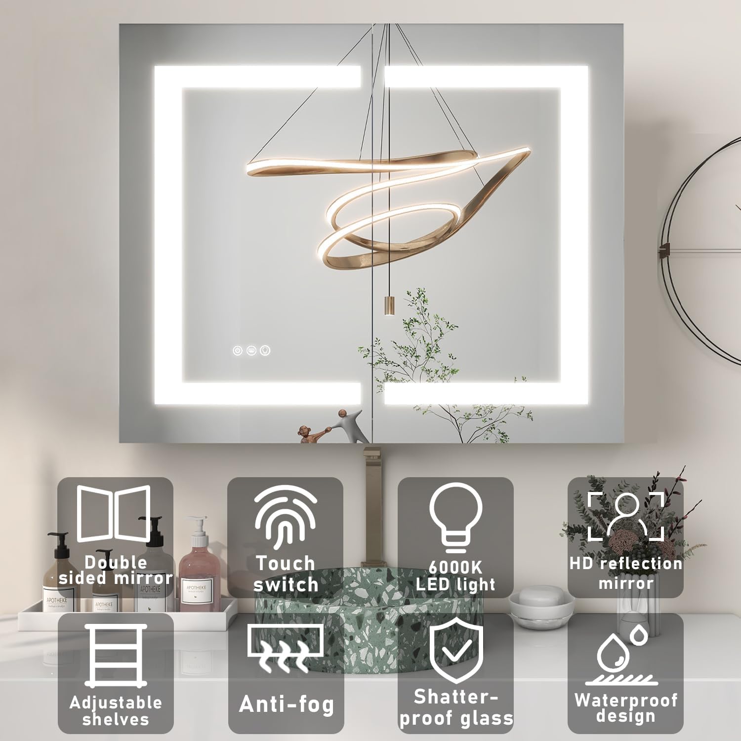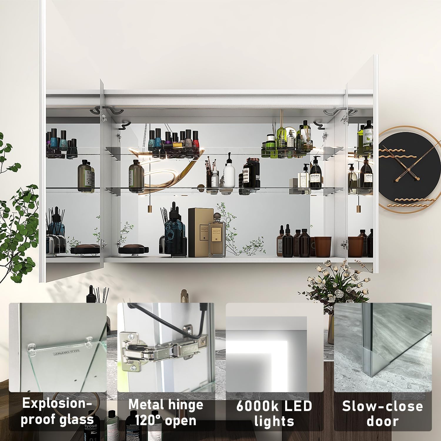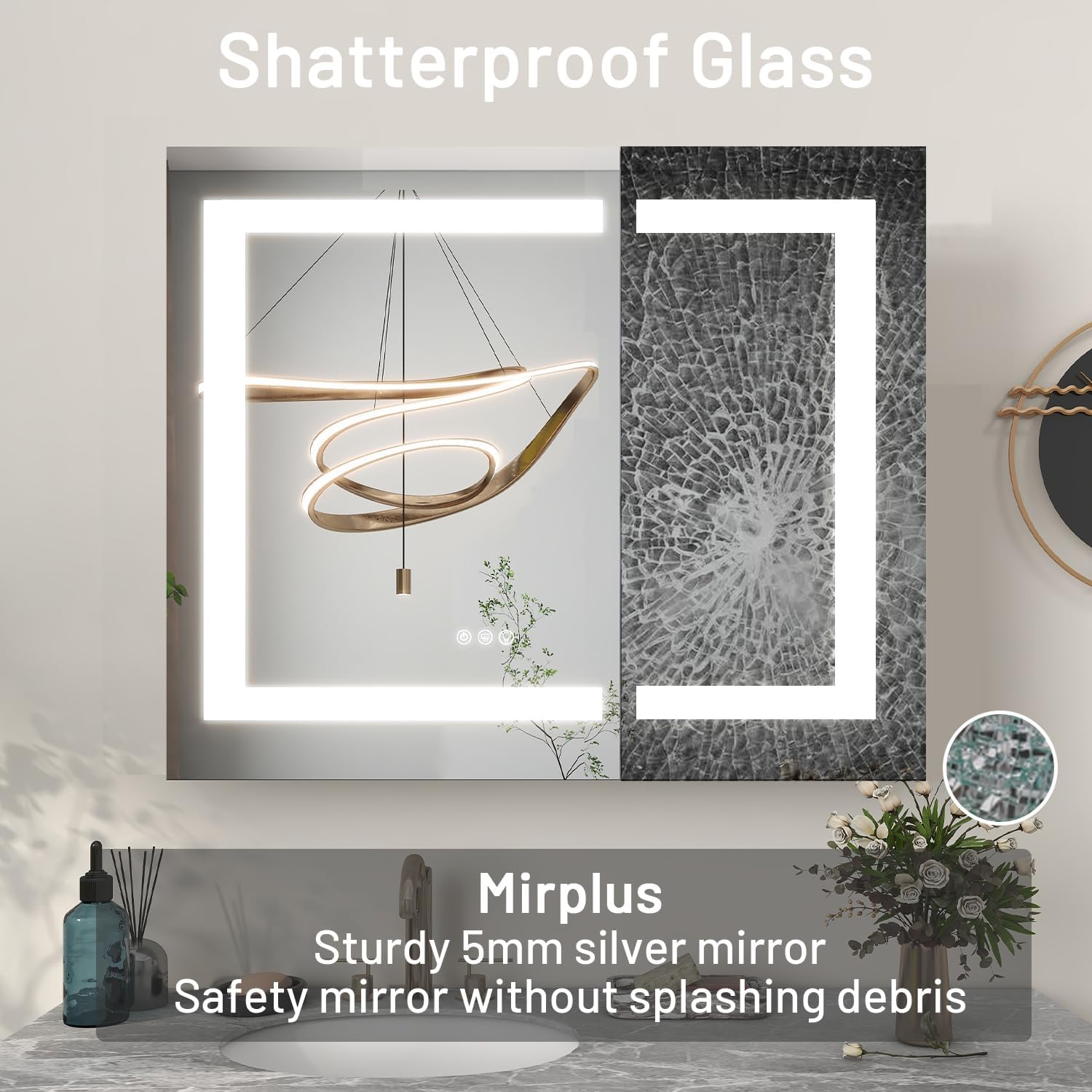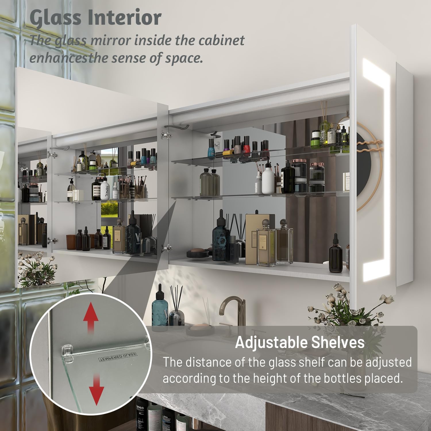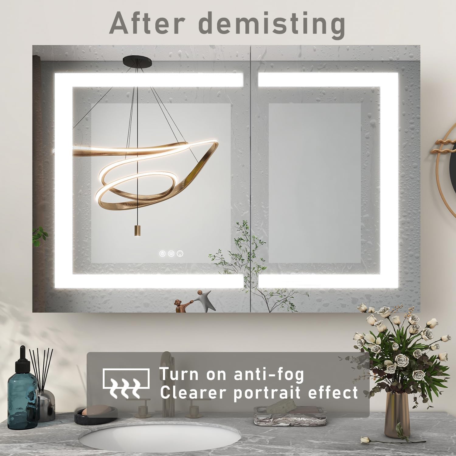 【LEHkcvv Mirror with Anti-Fog】 Our medicine cabinet has mirror with LEHkcvv light and built-in high efficiency defogging system that keeps the mirror clear and blur-free even when using hot water or steam. The defogging function uses intelligent heating technology to automatically adjust the temperature of the mirror to prevent water vapor condensation. You don't have to worry about wiping the mirror after each use a feature that offers great convenience especially in cold or wet weather conditions.