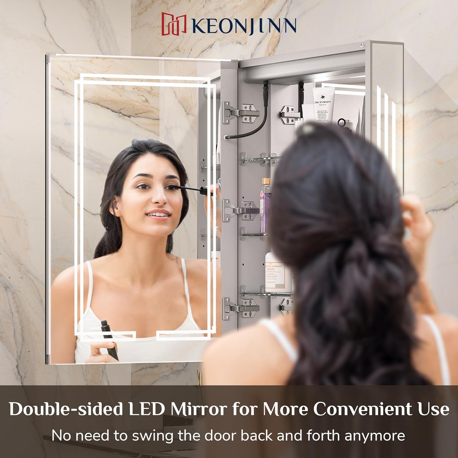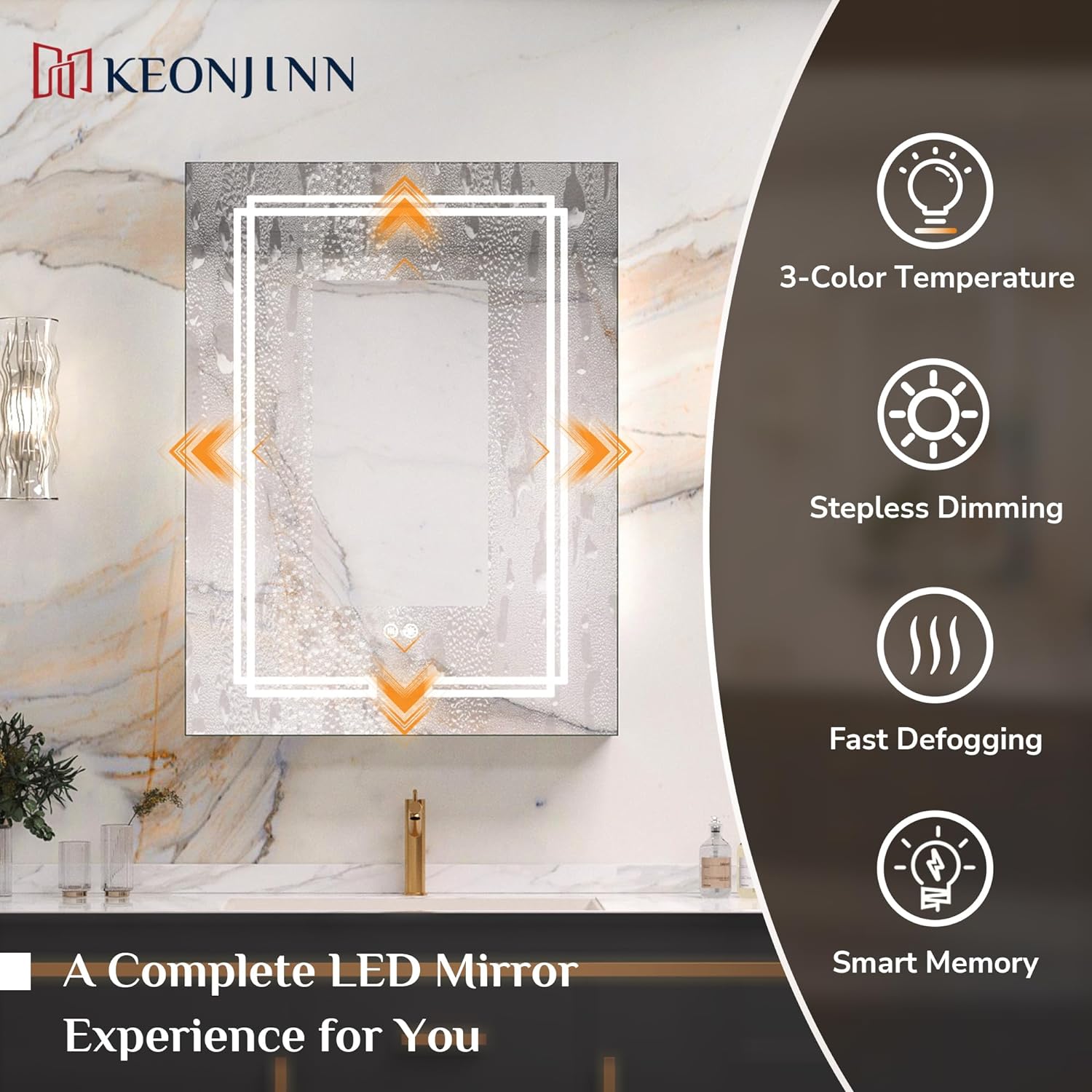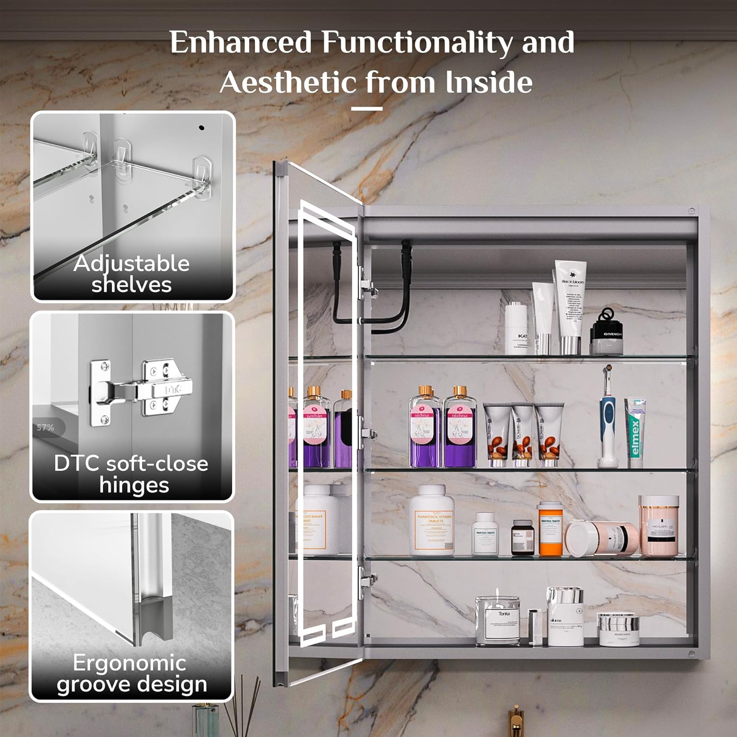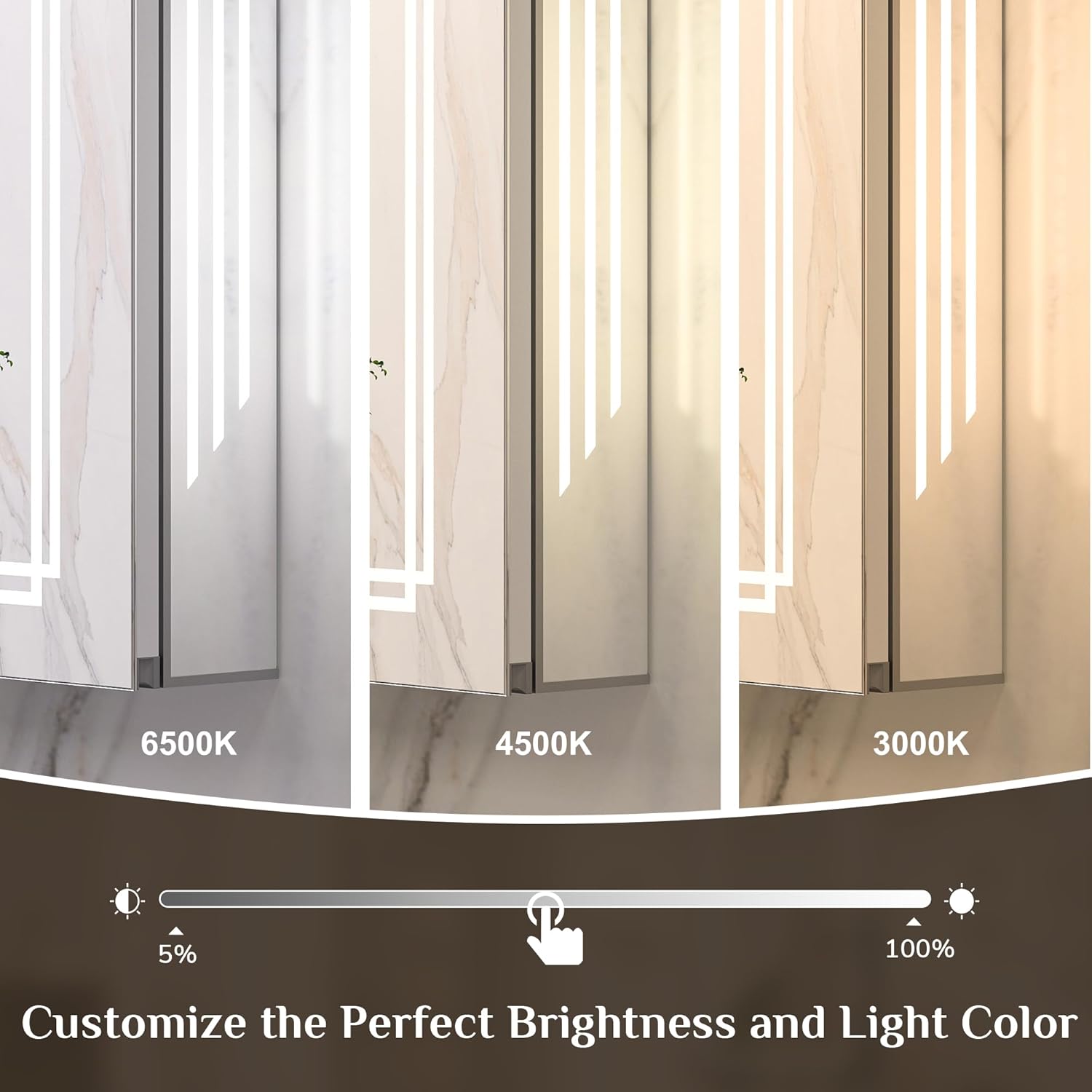 • Hkcvv 30 x 32 Inch Lighted Medicine Cabinet with Lights LEHkcvv Medicine Cabinet Mirror for Bathroom Tempered Glass Adjustable Shelves No Outlets 3 Color Temperature Anti-Fog Surface Mount Only
