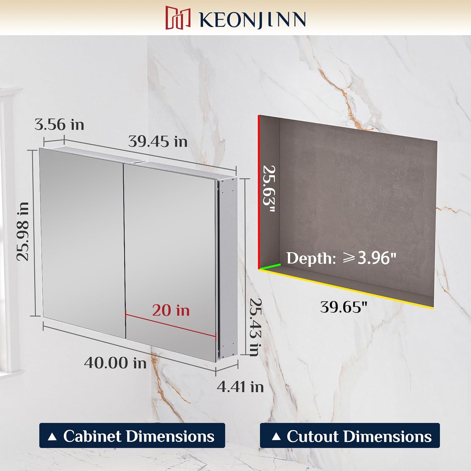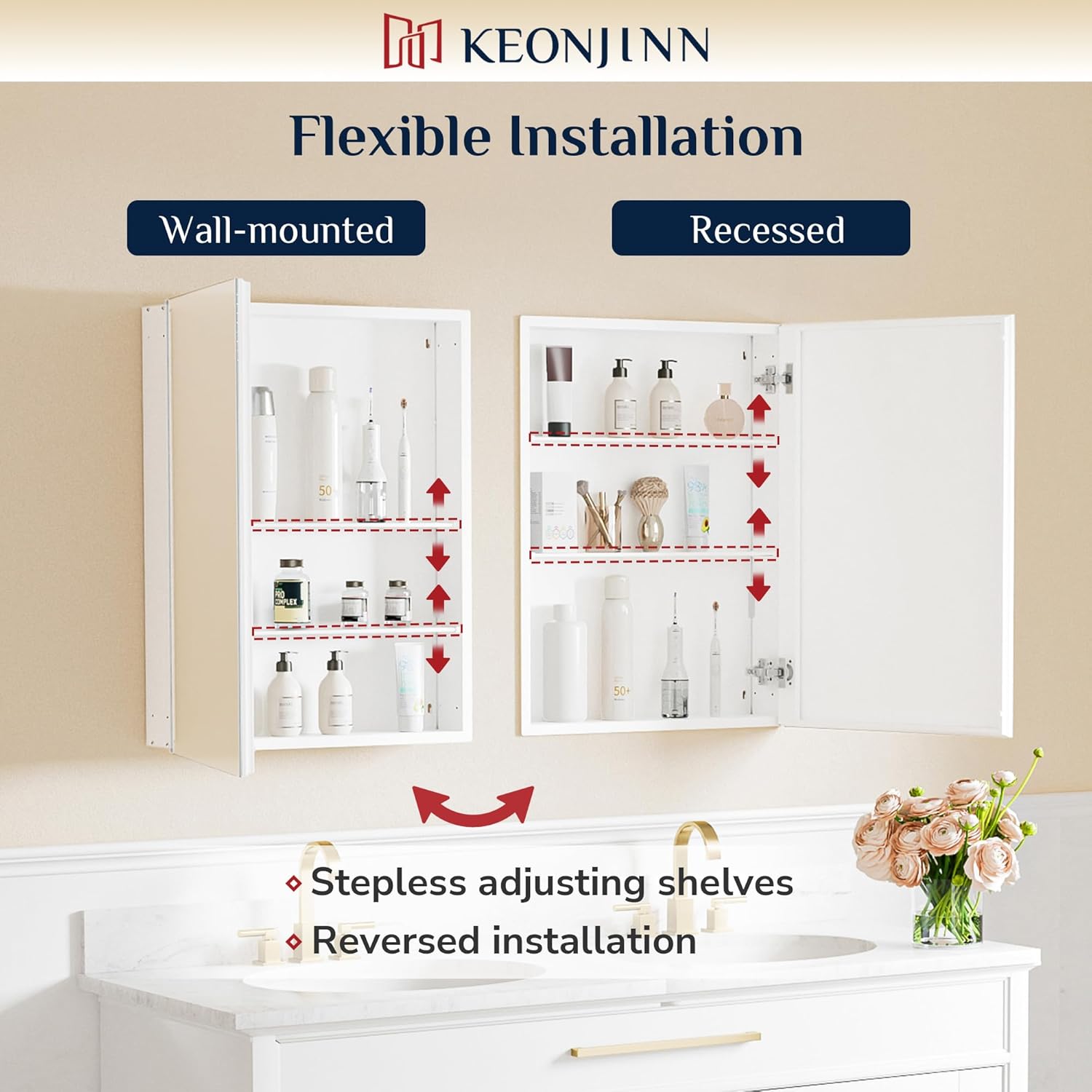 【Tailored Storage & Flexible Installation】This mirrored cabinet for bathroom can be customized to meet your needs. The freely adjustable and removable shelves can fit a variety of items of different heights for a tidy bathroom life. Wall-mounted or recessed are both supported by our cabinet. Reversed installation enables the cabinet door open to left or right. No matter what the layout of your bathroom space is there is always a suitable place for it.