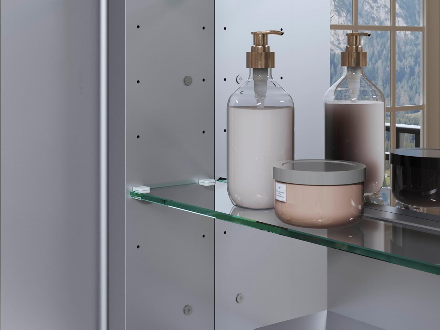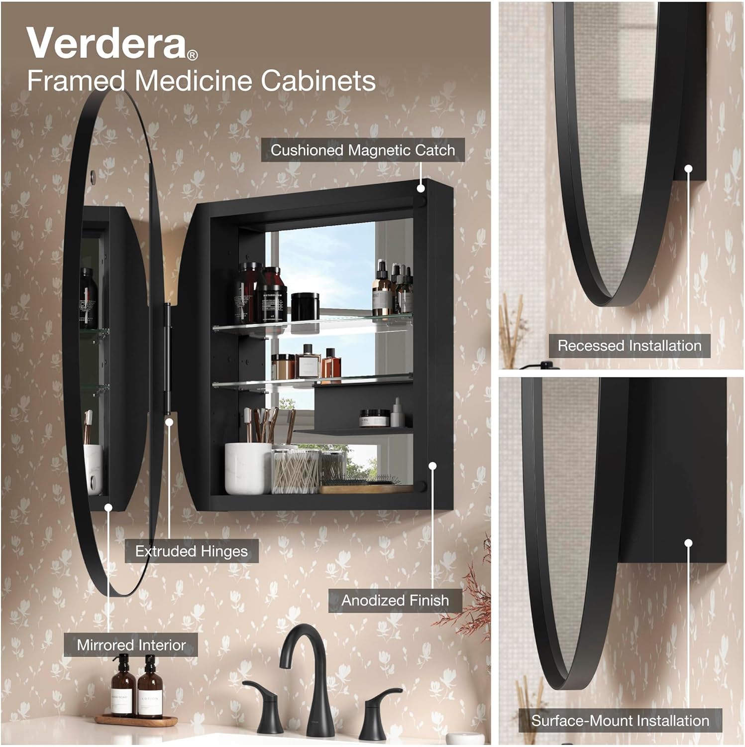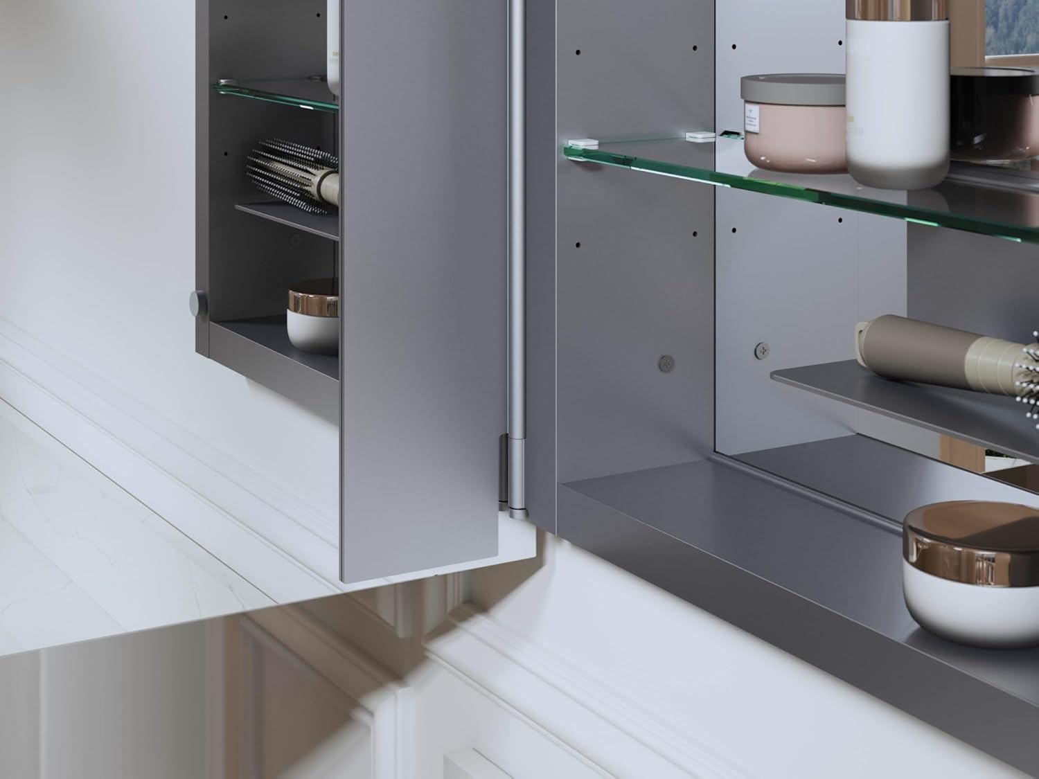 These mirrored medicine cabinets feature hinges with 110° opening capability