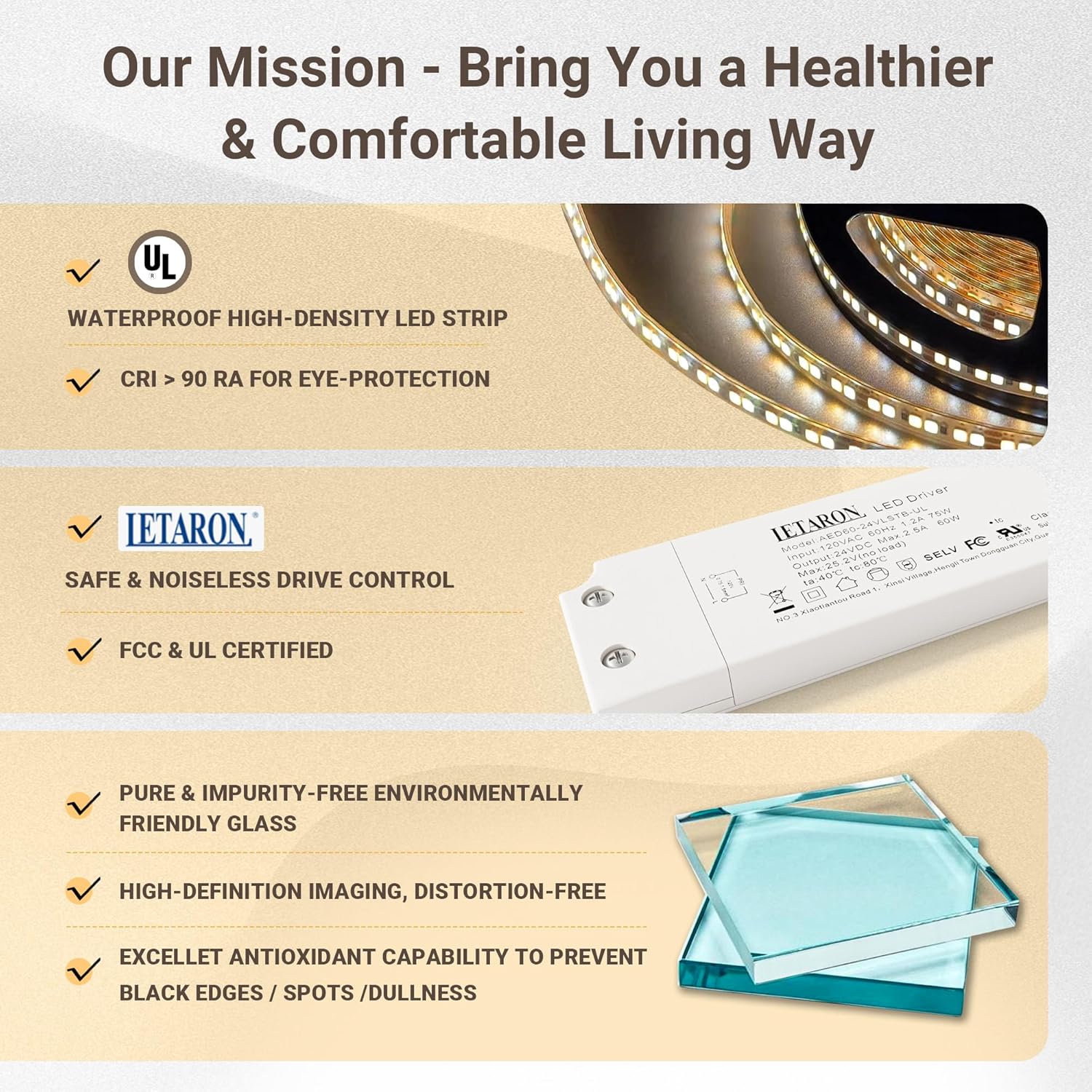 Safe-Using & Professional Customer ServiceUtilizing UL-certified, high-density LED strips (CRI > 90) with a 50,000hr lifespan (equivalent to 45 years at 3hrs/day). The electrical control, FCC&UL certified, guarantees waterproof, noiseless operation, prioritizing safety. ETL certified overall, it offers a 2-year warranty and 24/7 worry-free customer service.