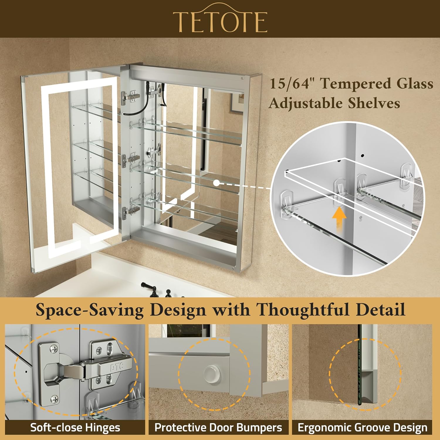 【2 Outlets & 2 USB Ports for Convenient Charging】The led bathroom mirror with storage and lights features 2 outlets (125VAC/20A) and 2 USB ports allowing you to easily charge beauty devices electric toothbrushes hair dryers and shavers directly in your bathroom. Thoughtful details like soft-close hinges an ergonomic opening groove and protective door bumpers enhance durability and convenience facilitating your daily routine.
