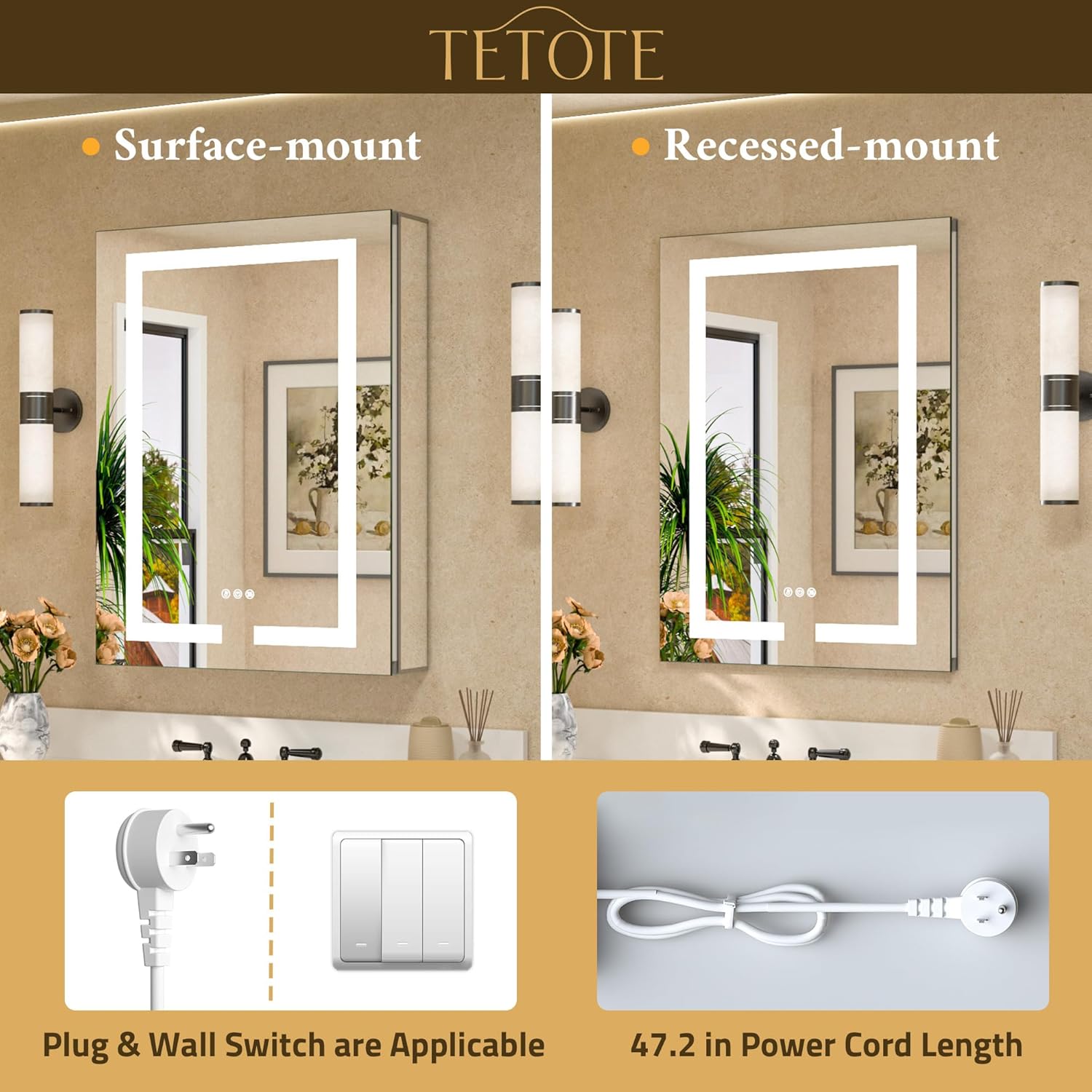 【Versatile Installation Options for Easy Setup】The light up smart medicine cabinet mirror offers both recessed and surface mounting options for flexible installation. Compatible with plugs and wall switches the plug can be removed for hardwiring to a wall switch. The 47.24-inch power cord and included mounting hardware ensure a hassle-free setup in your bathroom.