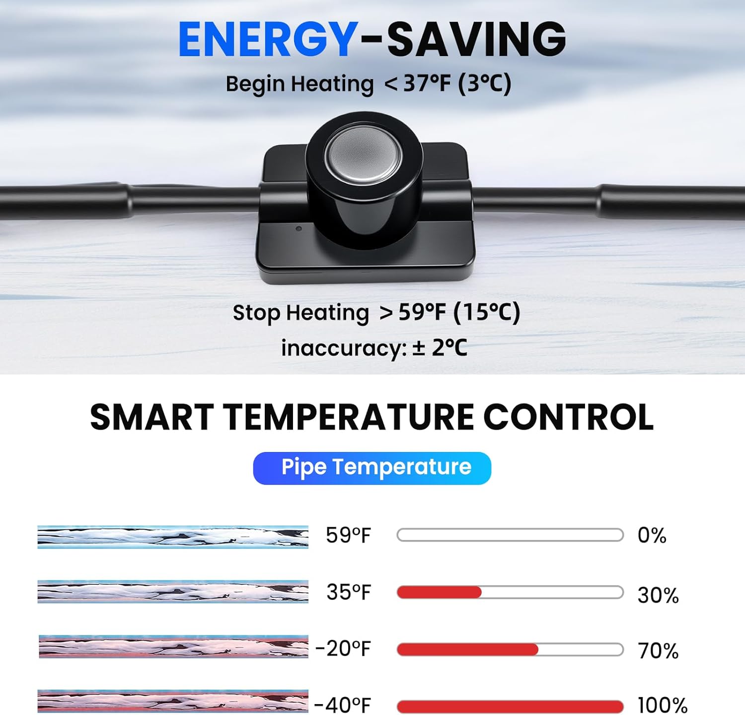 Smart Heat SystemEquipped with an intelligent self-regulating external thermostat the rv heated water hose ensures that water flows unimpeded even in temperatures as low as -35F (-37C). This system starts heating when the temperature drops below 37F (3C) and stops above 59F (15C) providing reliable freeze protection.