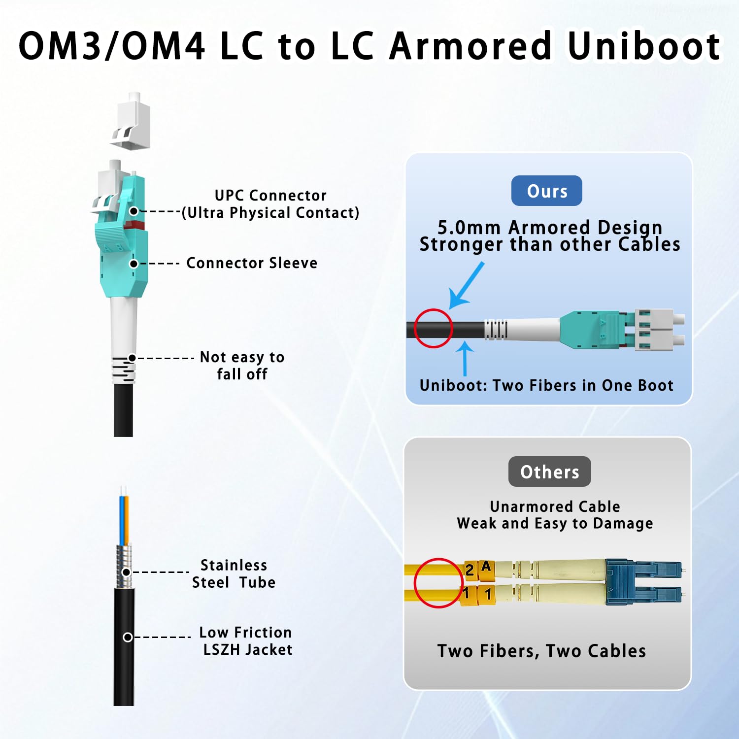 OM3/OM4 High-Speed Transmission up to 100GbpsThis armored fiber optic cable uses 50/125m multimode fiber to support high-speed Ethernet connectivity. At 850nm wavelength OM3 supports 10Gbps up to 300m 40Gbps up to 100m and 100Gbps up to 70m; OM4 extends these distances to 400m 150m and 100m respectively. Ideal for data center backbones enterprise LANs telecom rooms FTTH deployments server farms campus networks SAN/NAS storage interconnects broadcast studios control systems surveillance backhauls and other high-density high-bandwidth fiber optic infrastructure.