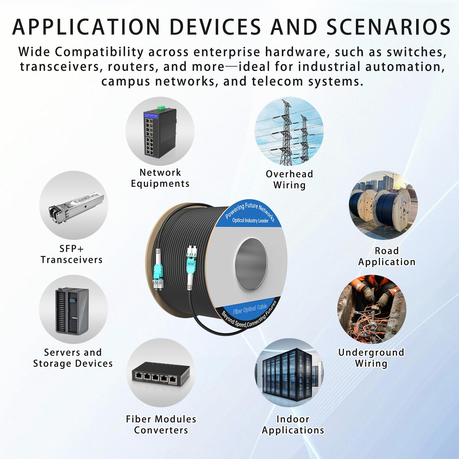 Space-Saving Uniboot & Broad Device CompatibilityLC uniboot connectors reduce cable clutter and enable quick polarity reversalideal for dense patching environments. This cable supports 1G/10G/25G/40G/100G SFP/SFP+/XFP/QSFP+ modules and integrates smoothly with Ethernet switches routers firewalls ONU/OLT terminals media converters patch panels NICs NVR systems fiber mux/demux units and industrial control equipment. Compatible with Cisco Ubiquiti Mikrotik Juniper HPE Arista TP-Link Netgear Intel Fortinet Zyxel Mellanox Supermicro Huawei ZTE Brocade D-Link and others.