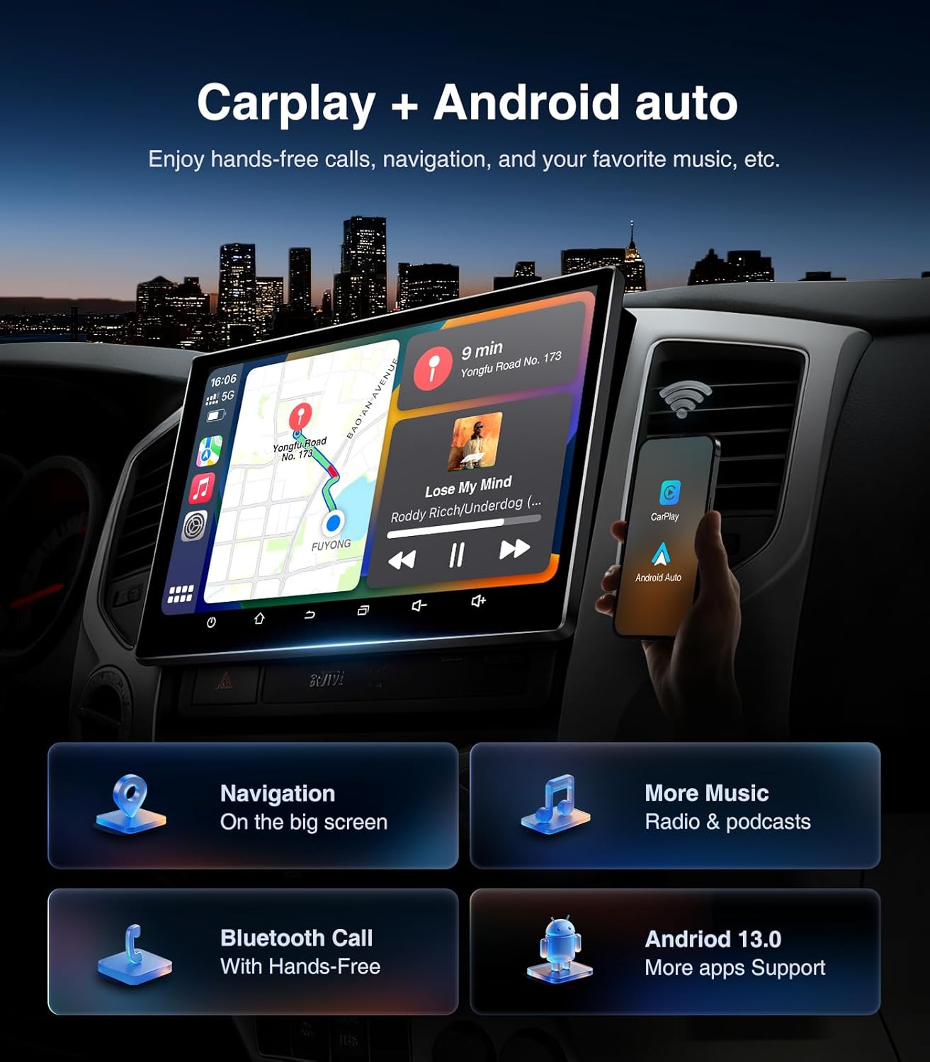 4+64GB Storage CarPlay & Android AutoPowered by Android 13 with 4GB RAM and 64GB storage this system delivers smooth operation and ample space for apps and media. Supports wired and wireless Apple CarPlay and Android Auto allowing seamless access to navigation calls music and smartphone apps.