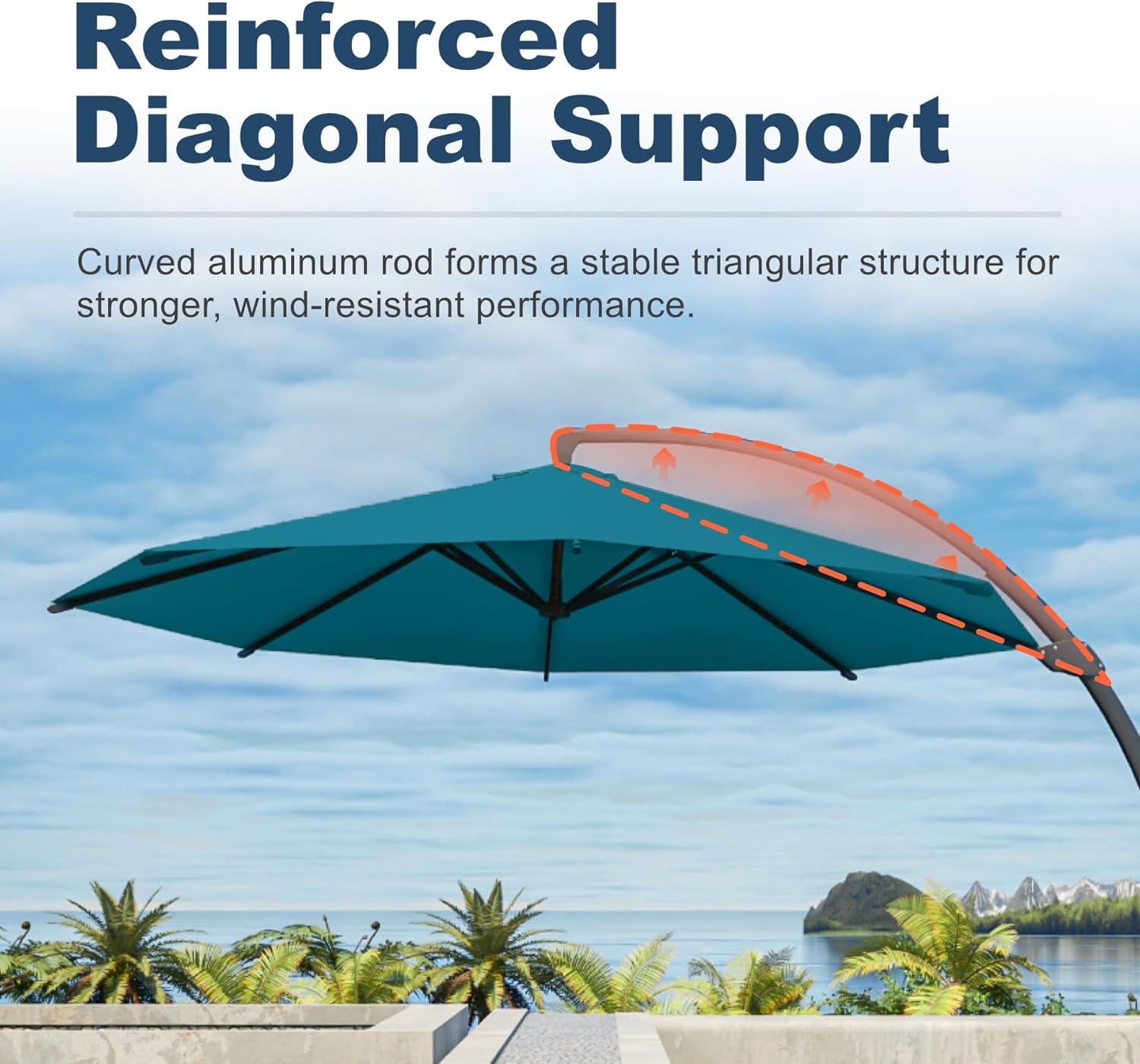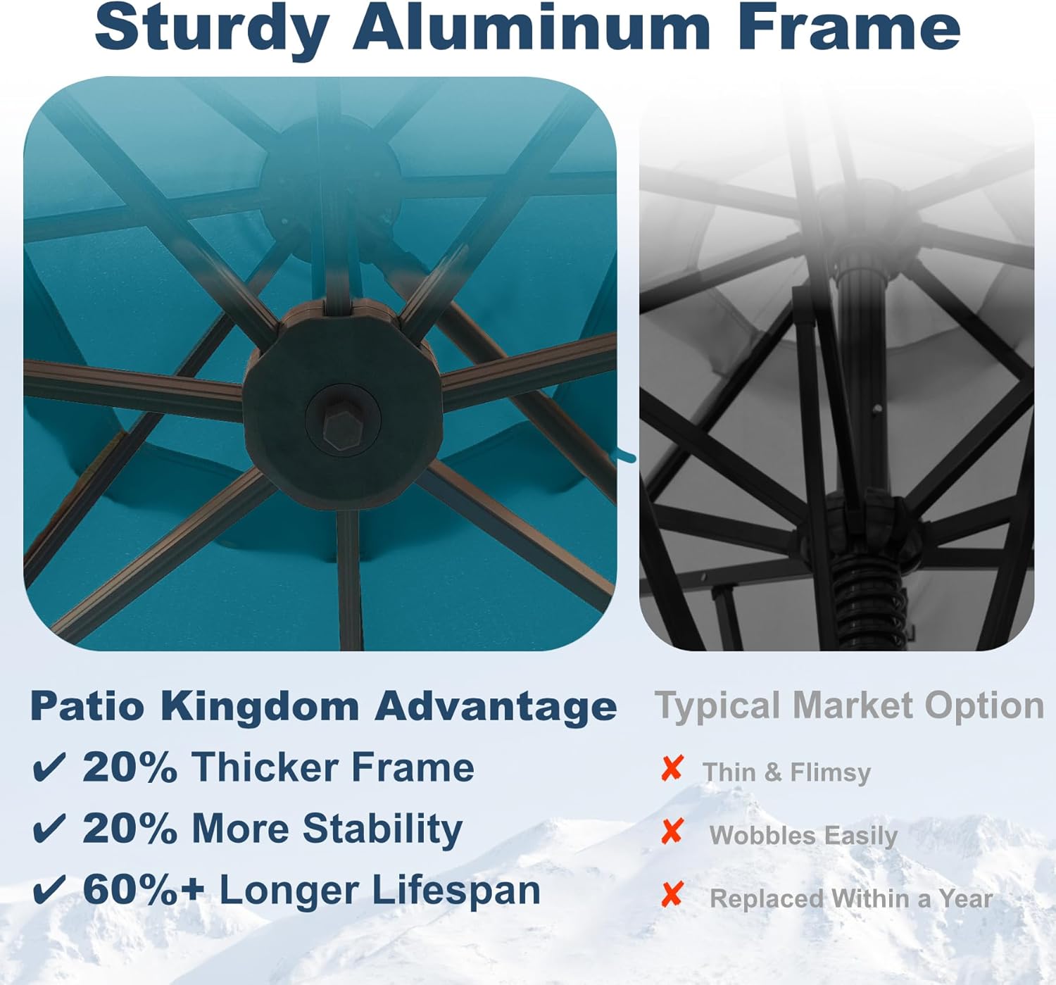 Sturdy & Wind-Resistant Frame: Built with 8 heavy-duty aluminum ribs and a reinforced powder-coated aluminum pole this umbrella ensures exceptional stability and durability. The vented top design enhances airflow improving wind resistance and cooling the shaded area.