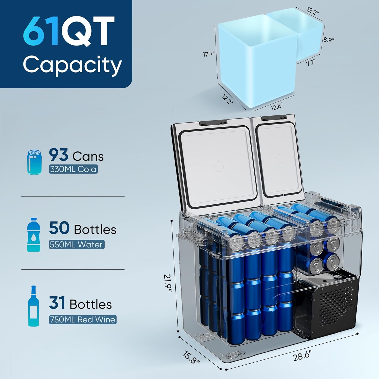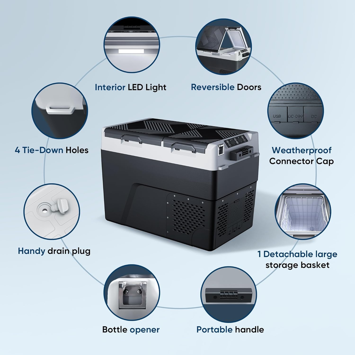 User-Friendly Design: The 12v refrigerator includes a removable basket for easy storage organization a bottom drain for quick cleaning and built-in LED lights that auto-light in darkness. Its ergonomic handle and compact size make the portable fridge easy to carry and space-saving.