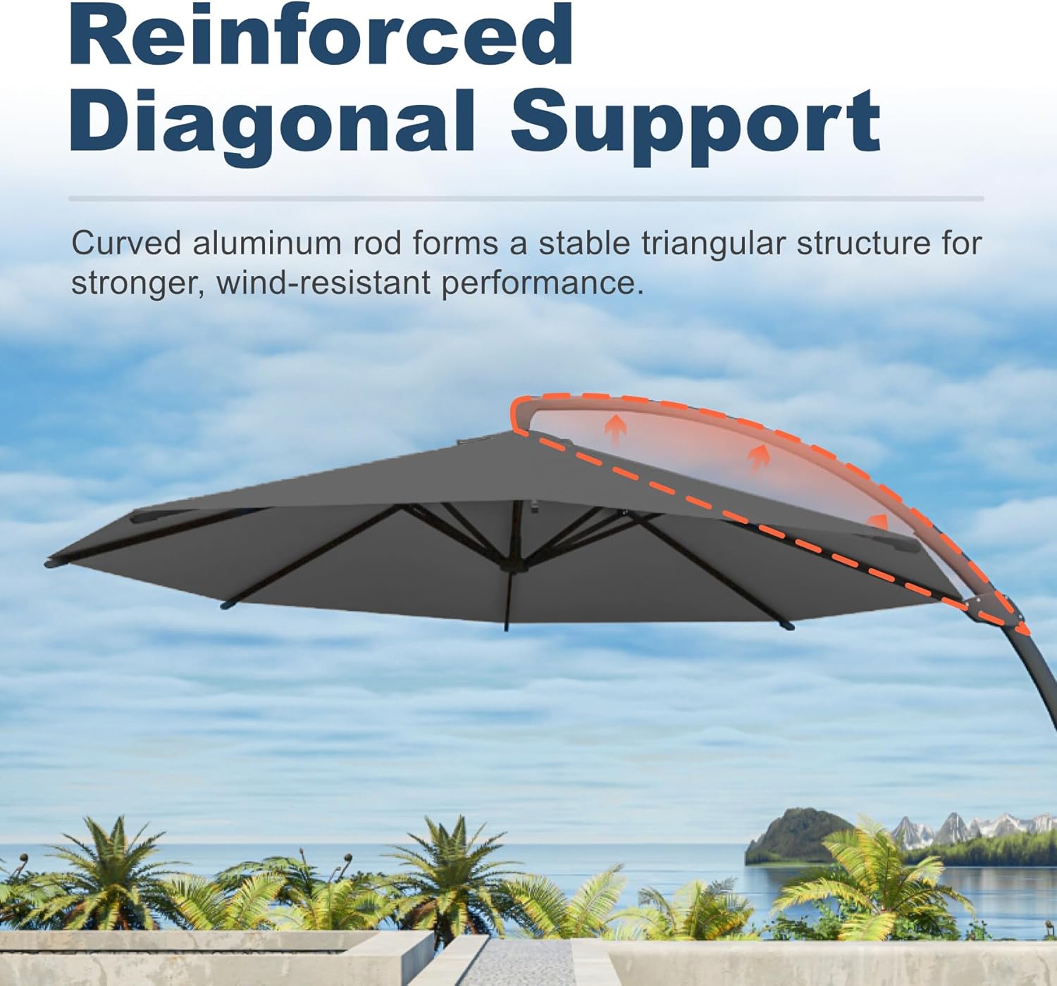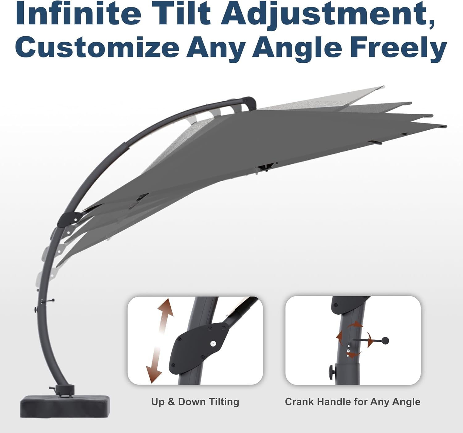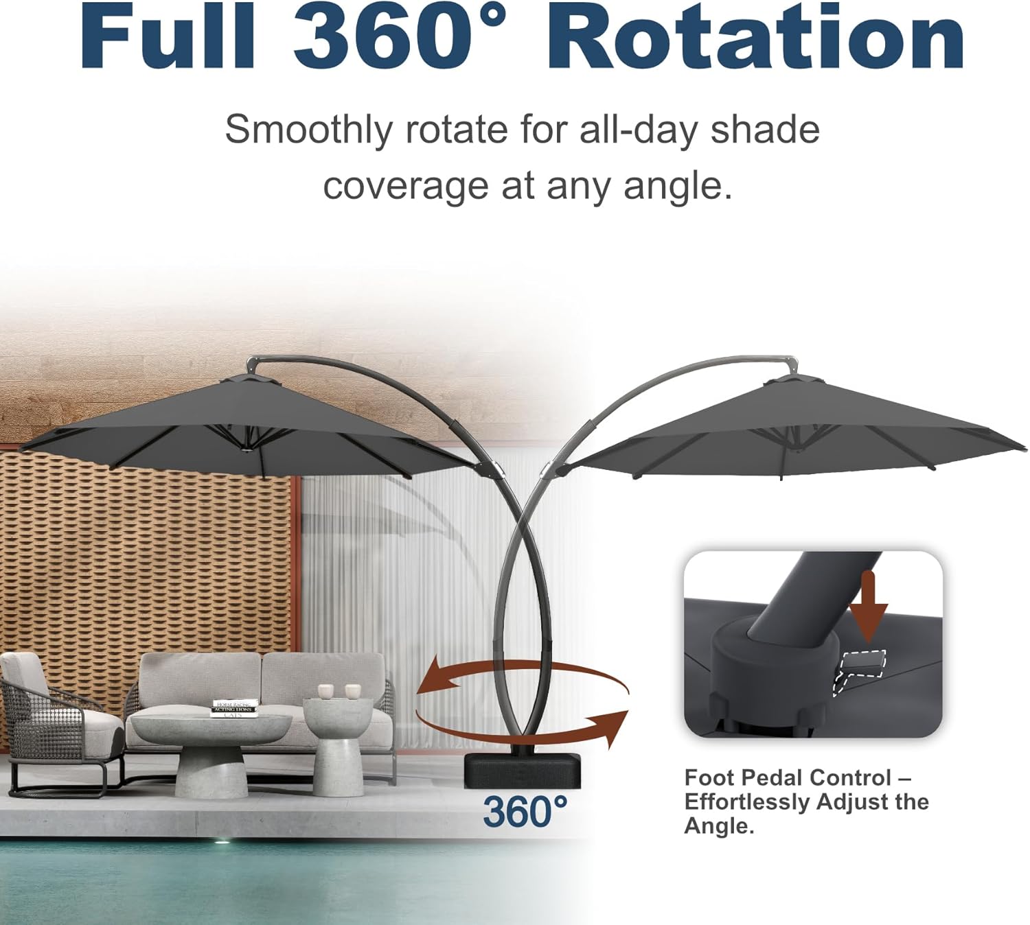 Wide Shade Coverage: Offering 113 sq. ft. of shade this large offset umbrella provides ample coverage for patios decks poolsides and gardens. The 360 foot pedal rotation and multi-angle tilt system ensure customizable shade throughout the day.