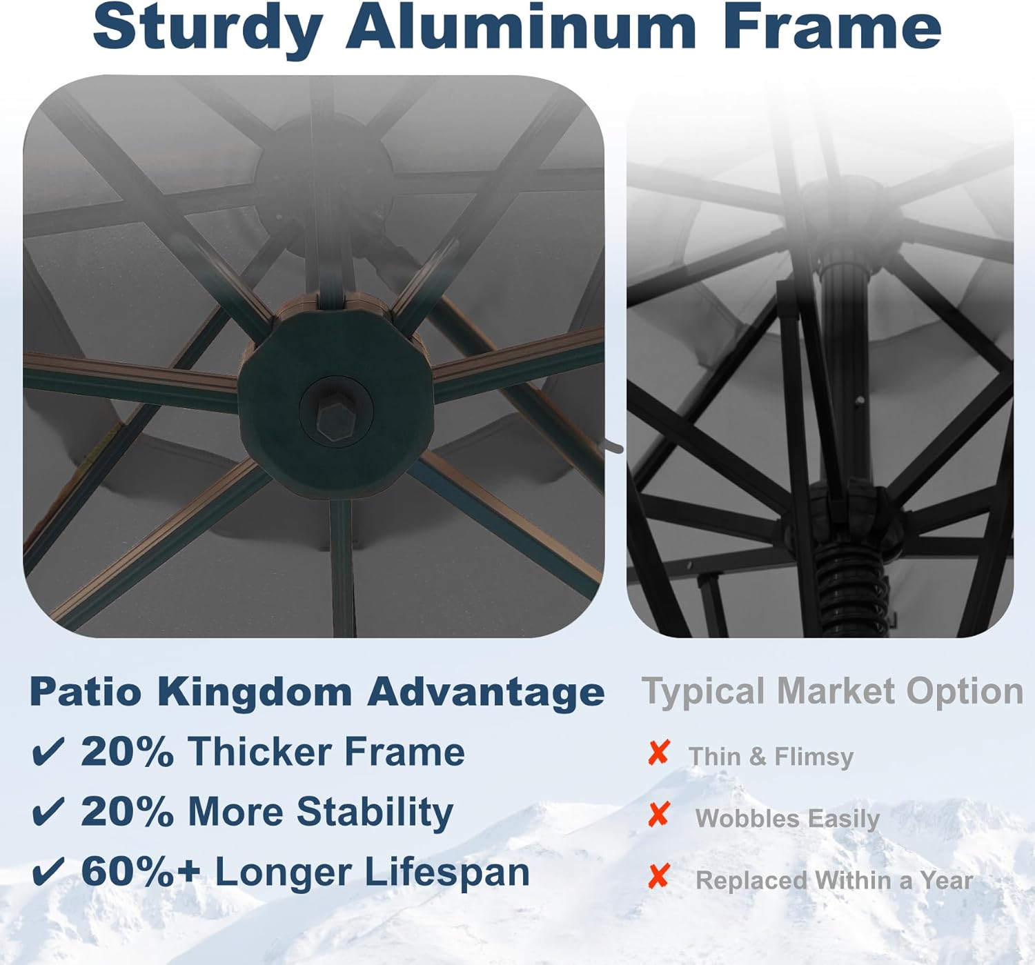Sturdy & Wind-Resistant Frame: Built with 8 heavy-duty aluminum ribs and a reinforced powder-coated aluminum pole this umbrella ensures exceptional stability and durability. The vented top design enhances airflow improving wind resistance and cooling the shaded area.