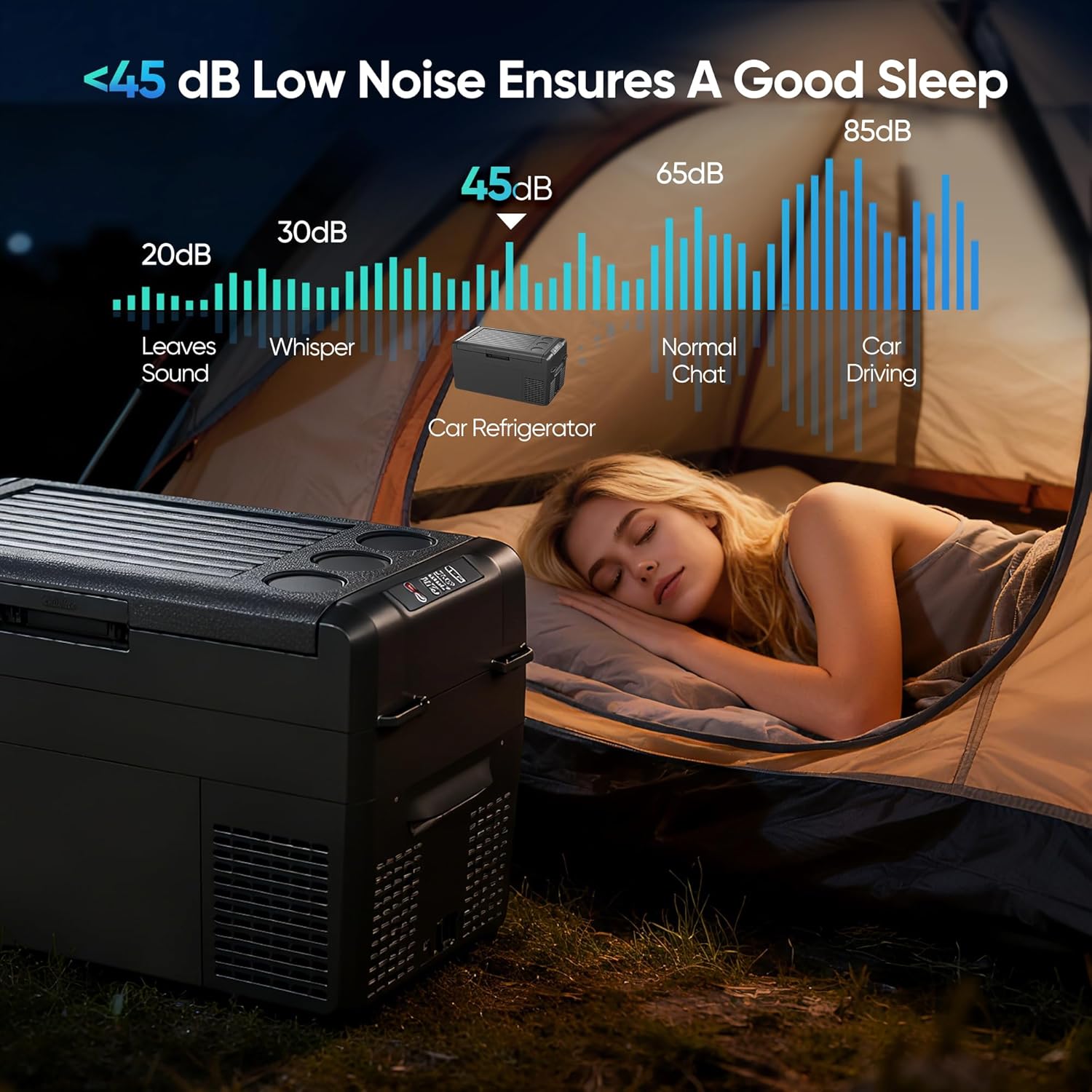 Quiet 45dB Operation & All-Terrain Stable CoolingAt a library-quiet 45dB this portable car refrigerator wont disrupt conversation or sleep. Four anti-shake anchor points keep it secure even on 40 slopes or rough roads ensuring consistent cooling in motion.