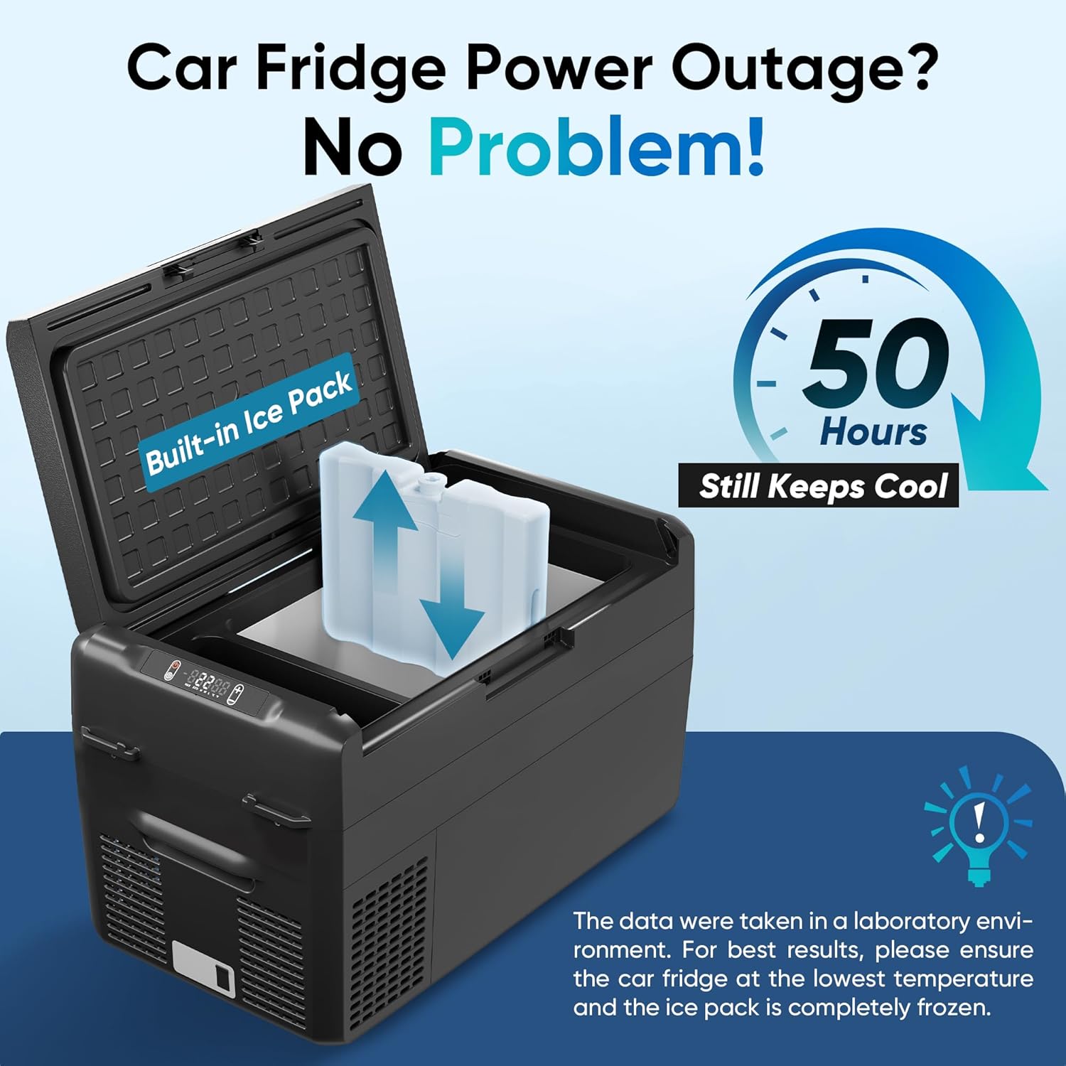 50-Hour Extended Freshness & Energy EfficiencyThis 12V refrigerator keeps your contents cold for up to 50 hourseven during outagesthanks to its ice pack and superior insulation. In ECO mode this portable car refrigerator runs on only 28W (1 kWh/day) delivering sustained cooling with minimal energy use.