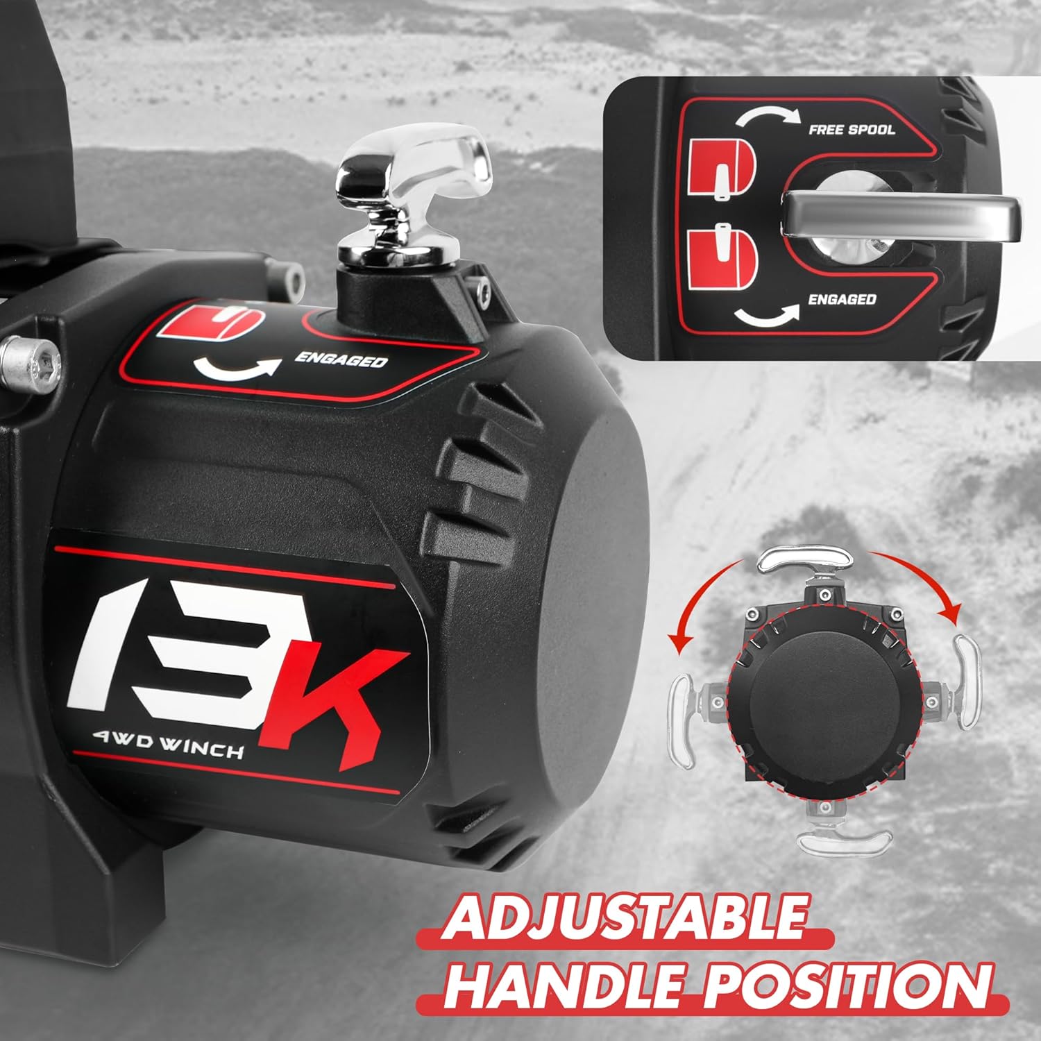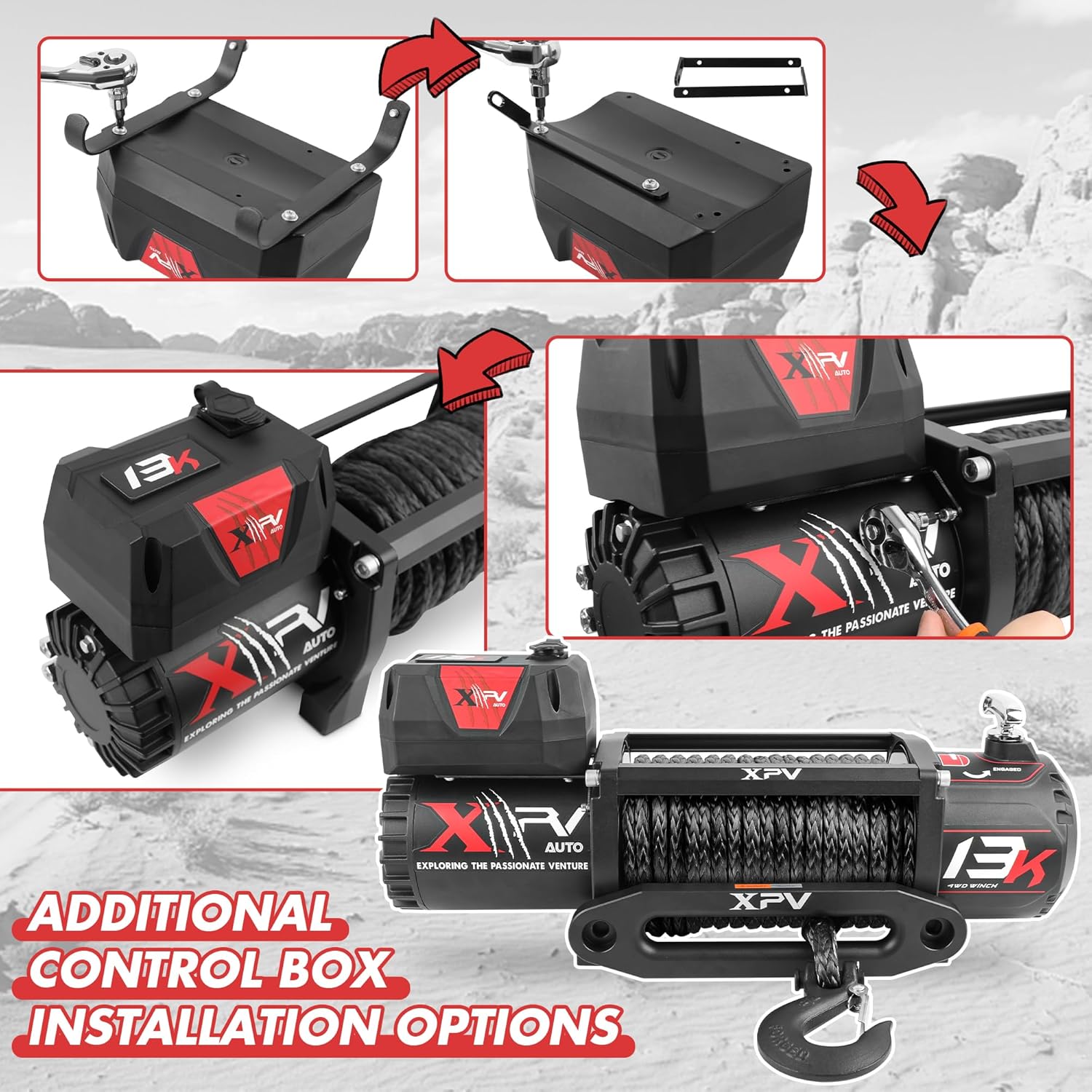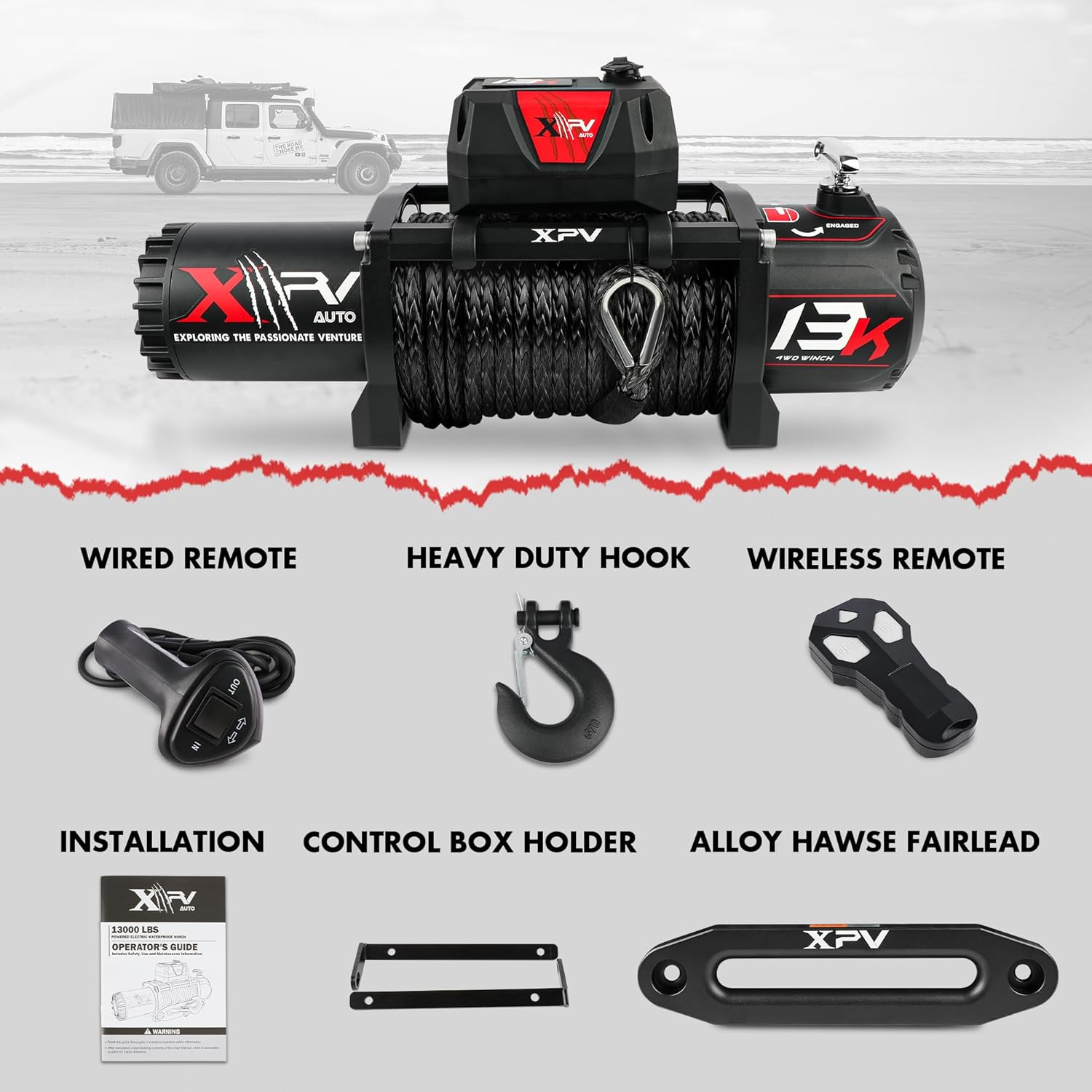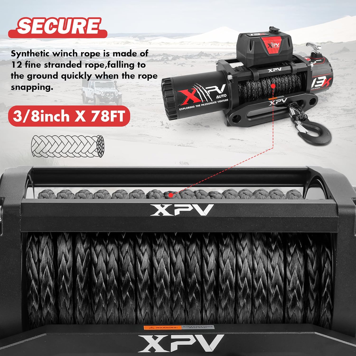 Winch load capacity: 13 000 lbs; 4.5 HP; Gear ratio: 265:1; Rope Size: 3/8inch*78ft; With 3-stage planetary gear system strong pulling force; Unique design is perfect for your Wrangler SUV truck and trailer making it more attractive and cool. The winch comes with lifetime technical support and one-year warranty.