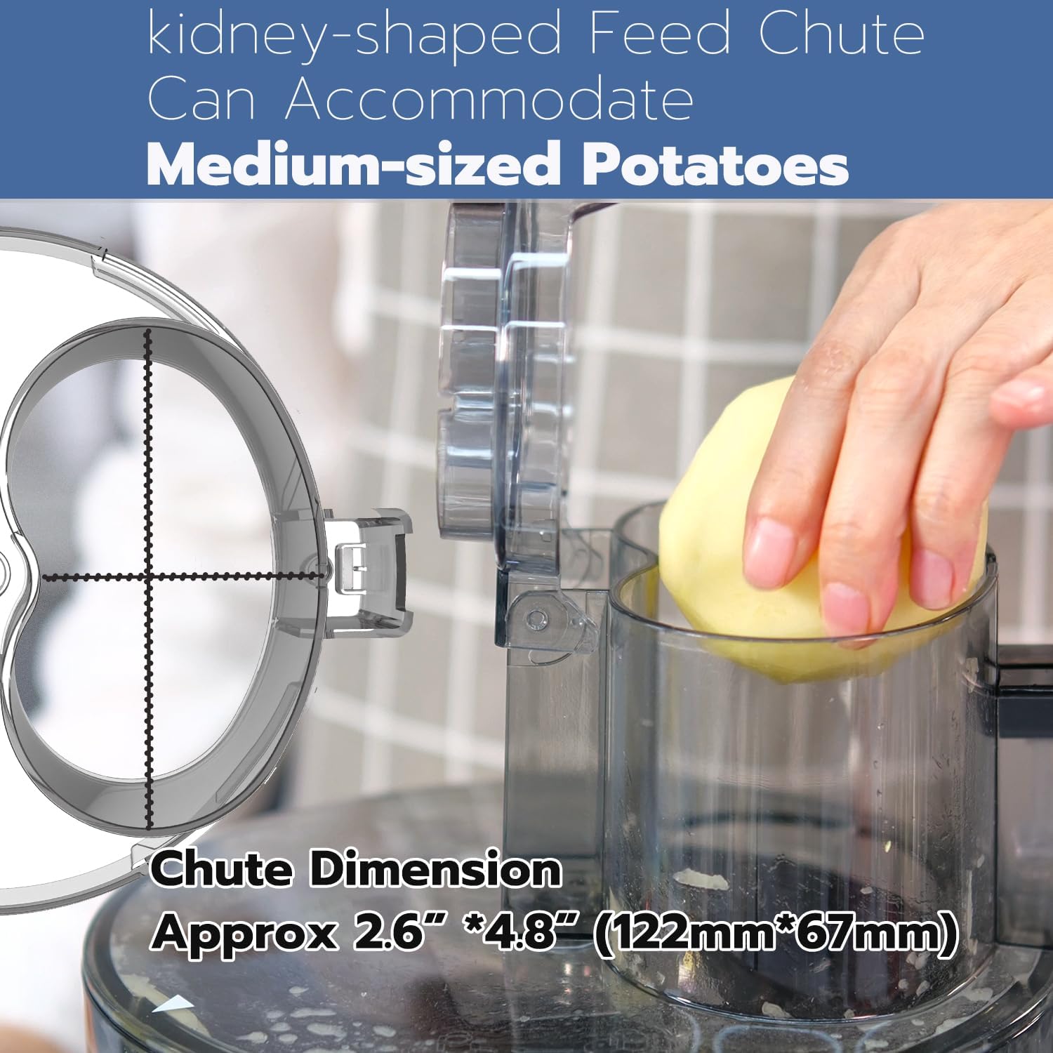 Large feeding chute Save time and effort with the extra-wide feeding chute. You can drop in medium-sized veggies or cheese blocks without having to cut them down first, making your food prep quicker and easier.