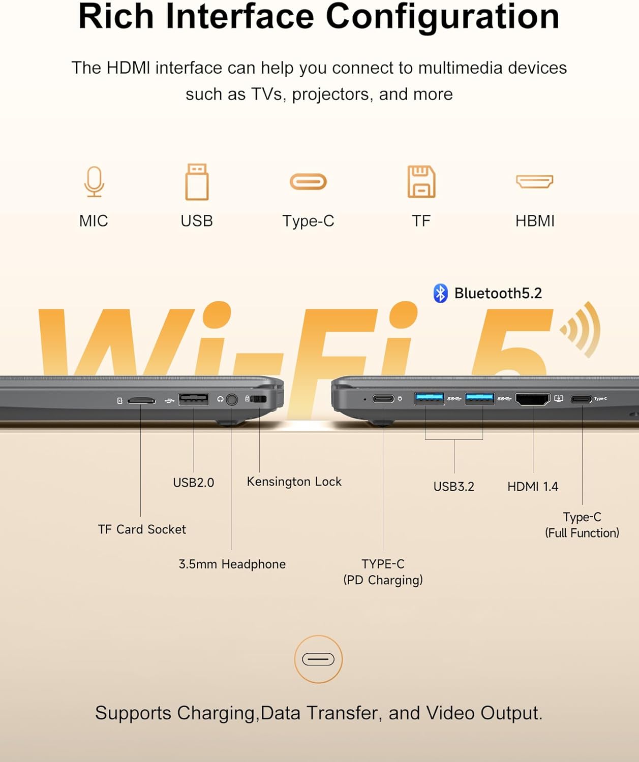 EXTENSIVE CONNECTION PORTS - This Laptop Features USB-C Full-Function Jack 2x USB 3.2 Jack 1x USB 2.0 Jack 1x HD-MI Jack 1x TF card slot 1x Headphone Jake 1x Type-C Charging Jack. It offers powerful wireless connectivity with support for 2.4G+5G WiFi and Bluetooth 5 for fast downloads and streaming. A full-size ergonomic keyboard and spacious touchpad enhance your typing and navigation experience.
