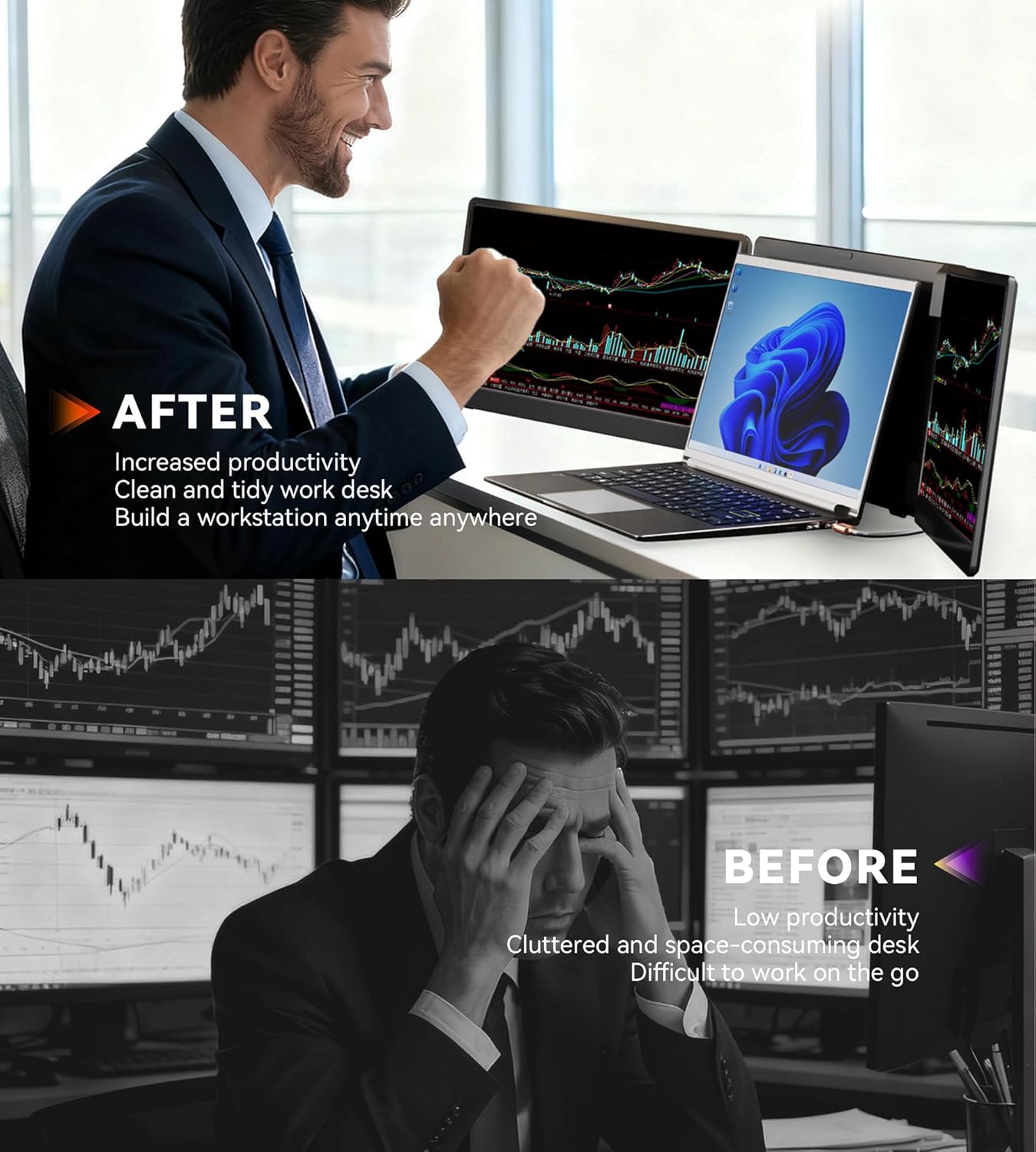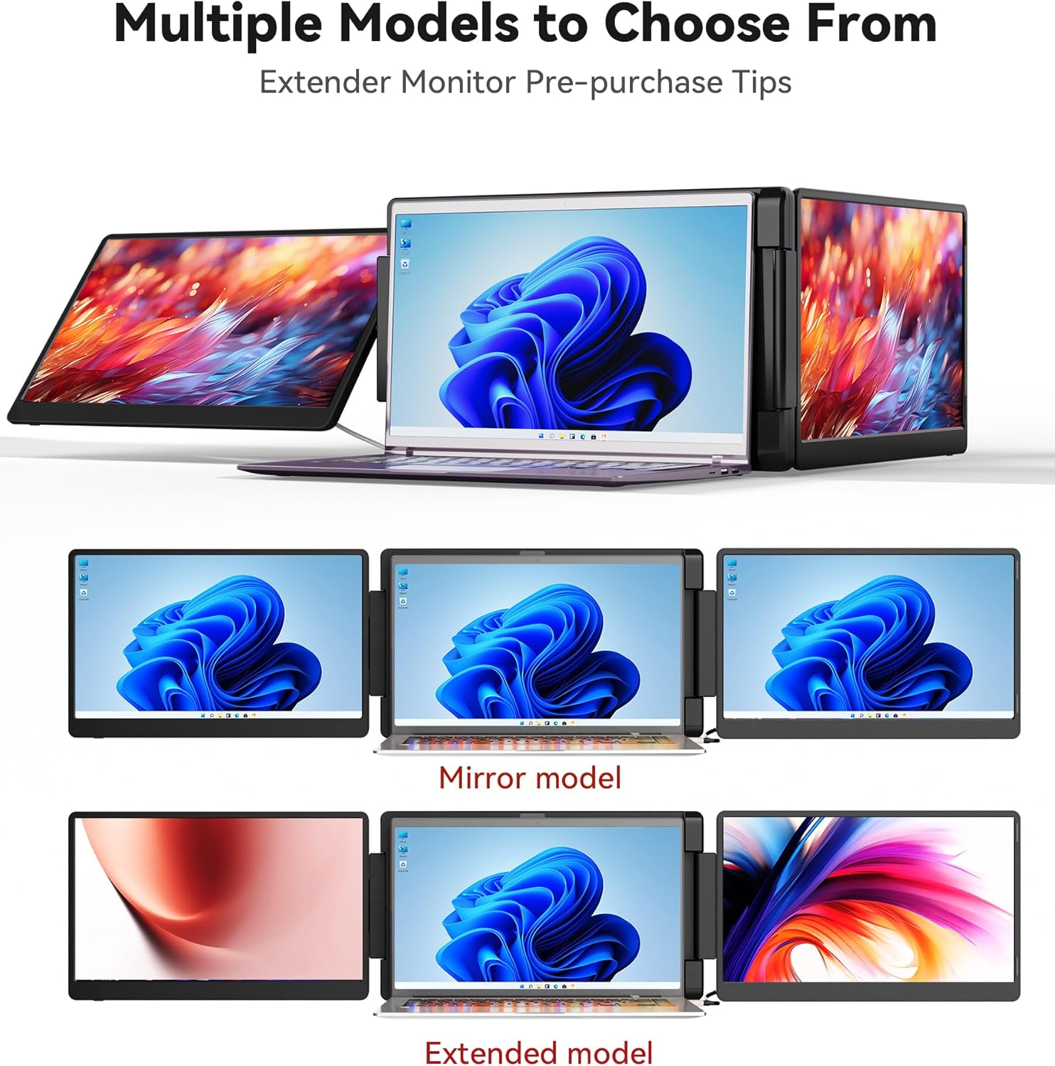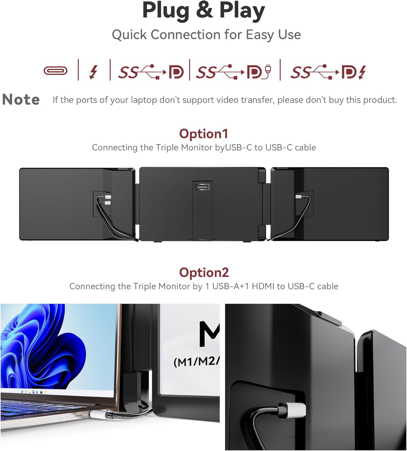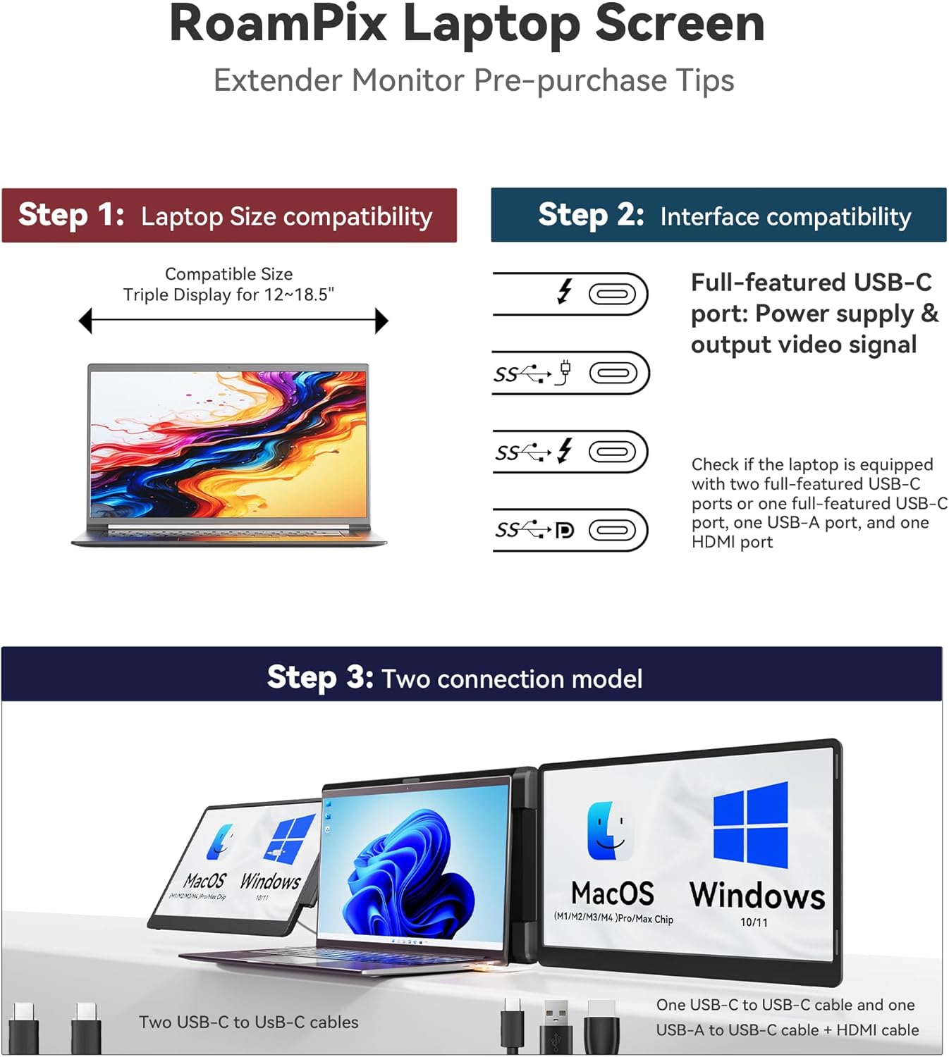 [Wide Compatibility] Triple Laptop Screen Extender delivers a hassle-free "PnP" experience. Simply connect with two USB-C cables or one USB-C cable along with an HDMI+USB-A cable no complex drivers required. Compatible with Windows and MacOS (supports only M1/M2/M3 Pro/Max chips not M1/M2/M3 chips.) This screen extender portable laptop suitable for laptops from 13" - 17.3".