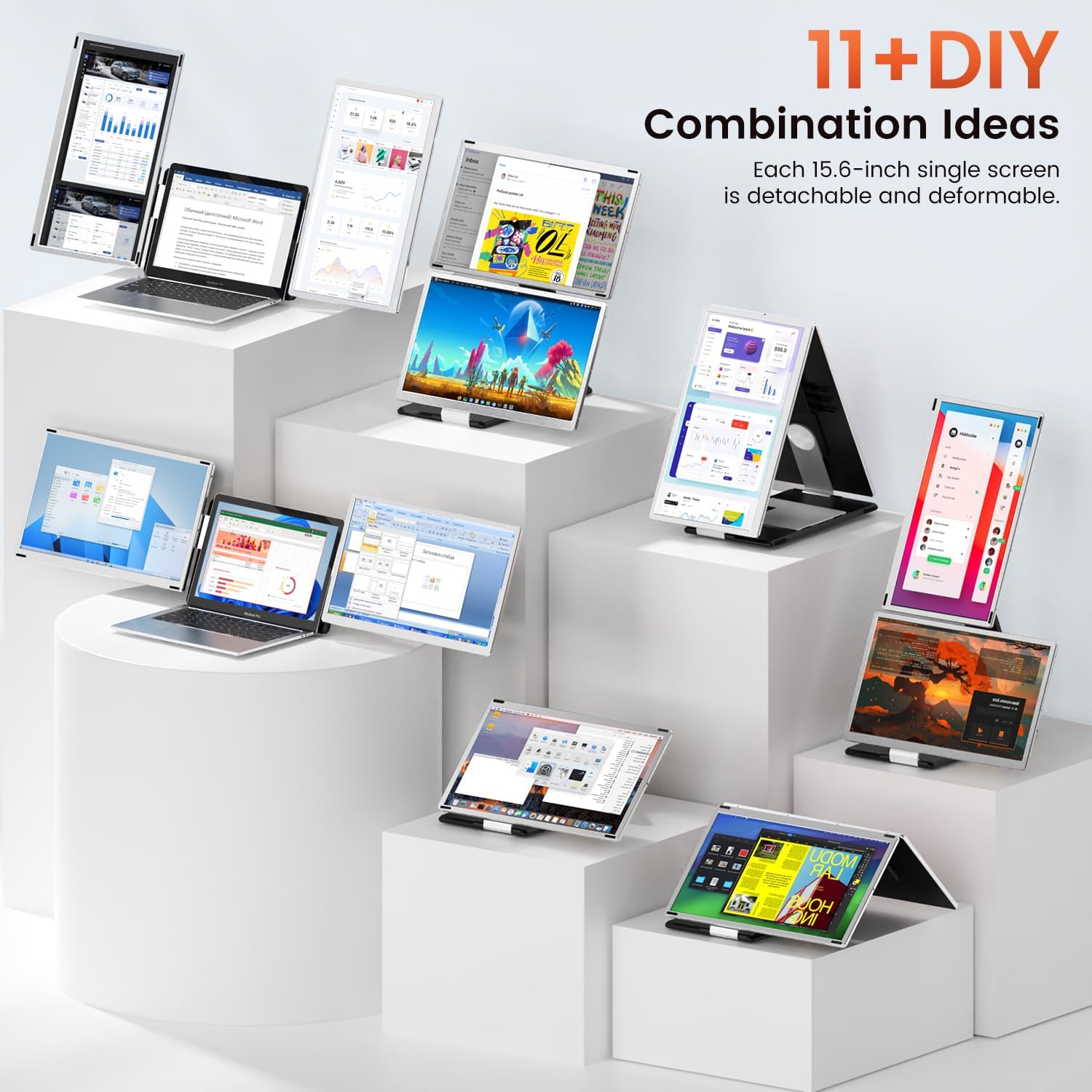 [11+ Configurations] Featuring dual monitor that can rotate both horizontally and vertically this device offers over 11 unique configurations. Whether you need a dual screen setup for multitasking or prefer a single screen for focused tasks this screen extender can be easily detached or combined to meet your needs-turning your laptop into a dynamic workstation!