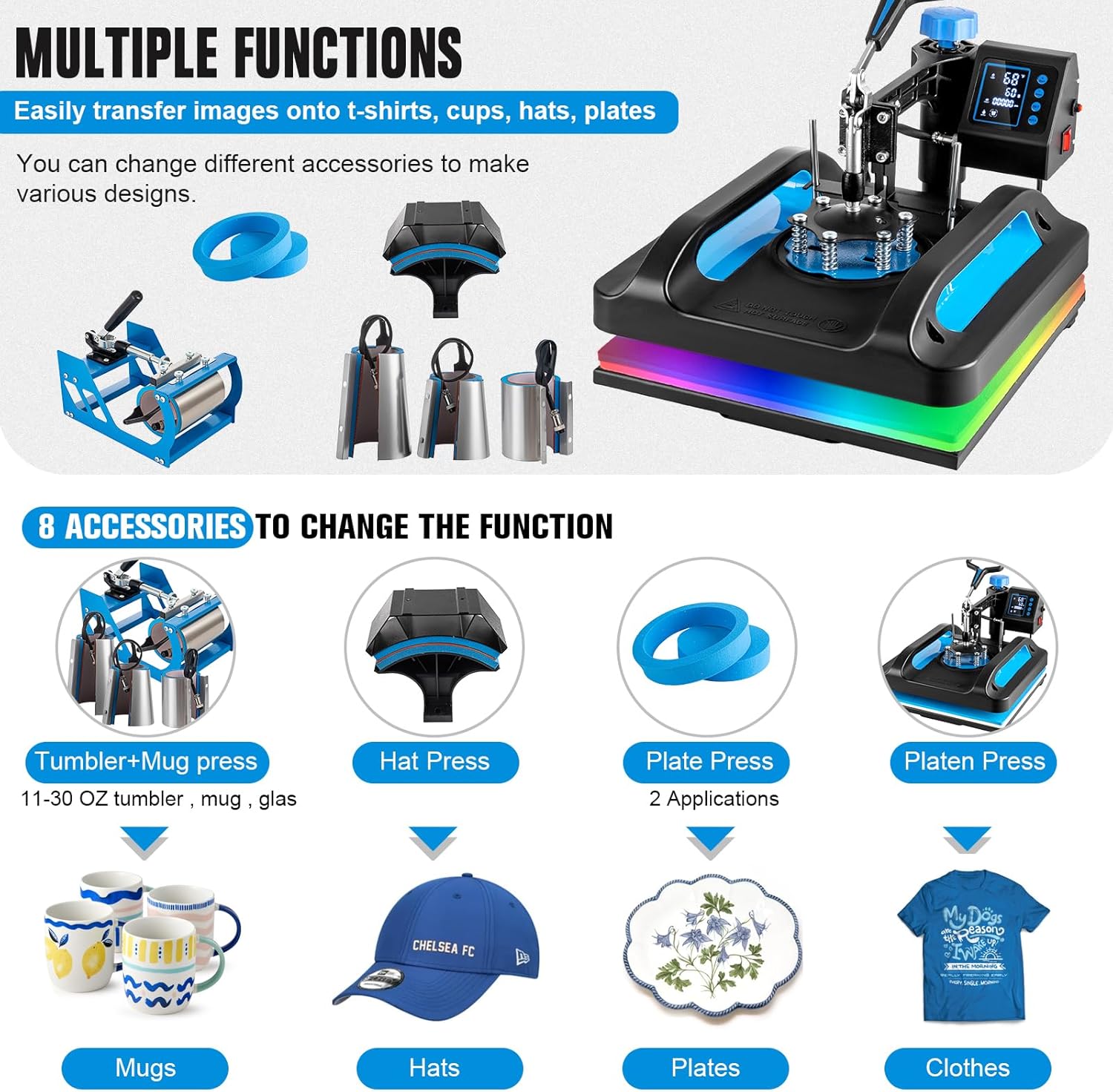 8IN1 HEAT PRESS MACHINE -- With this versatile machine you get a 15"x15" T-shirts press machine a 5.5"x 3" Hat press 6oz 11oz 12oz 17oz mug press a 5" Plate Press and a 6" Plate Press. Unlock the creative possibilities with our heat press machine! Print designs effortlessly onto various items like T-shirts canvas bags pillowcases caps mugs tumblers ceramic plates and beyond using heat transfer techniques. Dive into DIY projects with ease and make your crafting endeavors both simple and fun!
