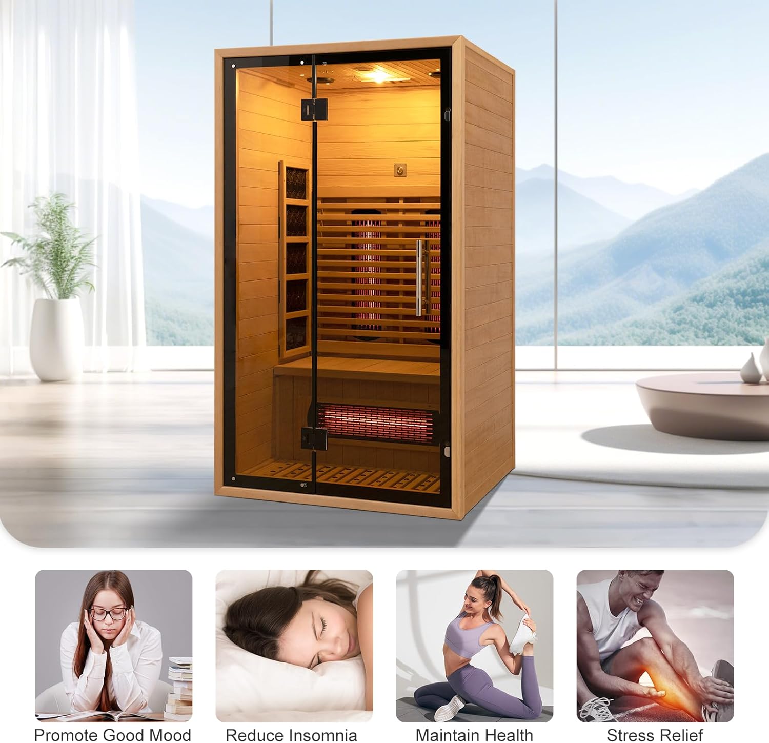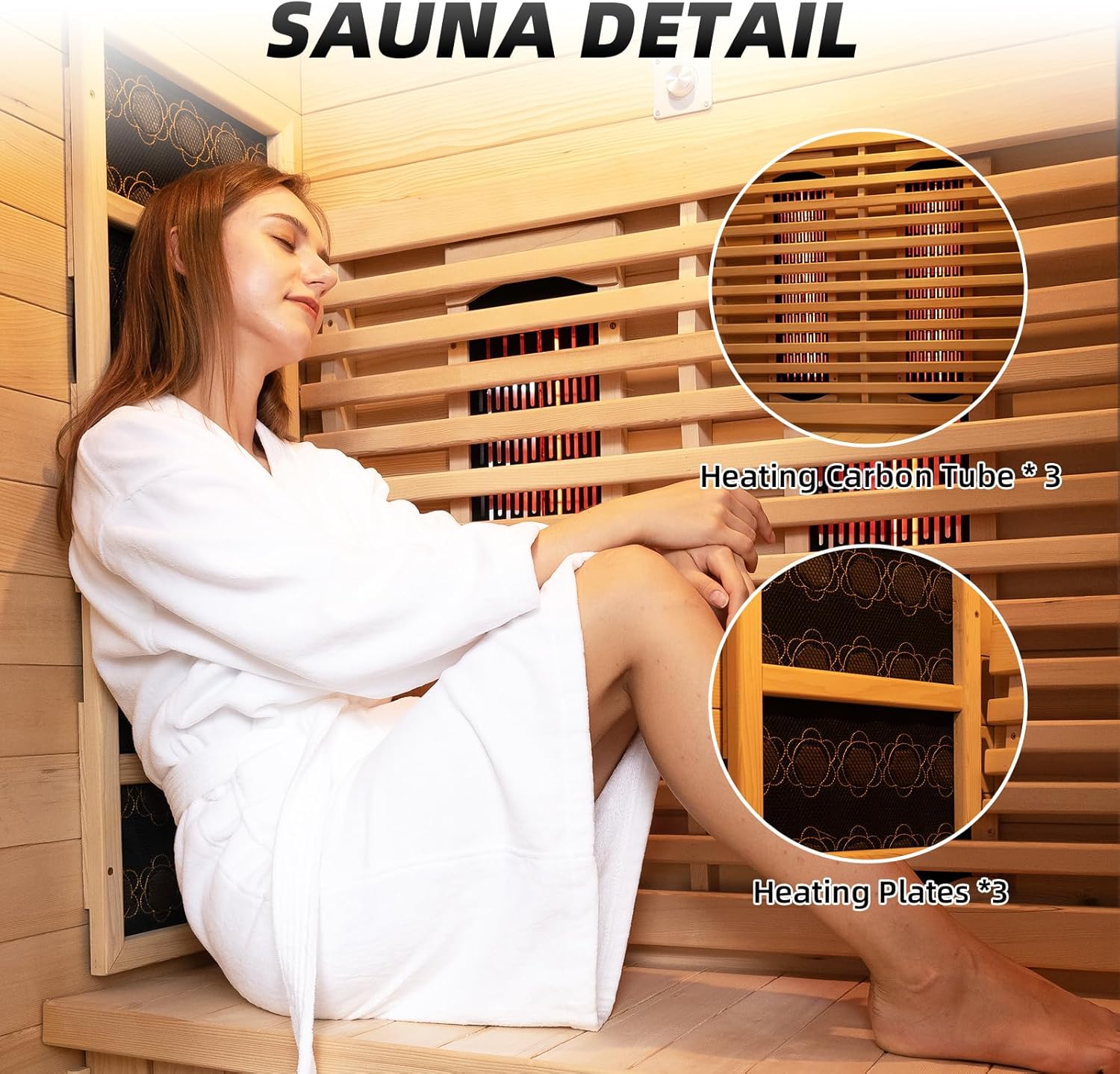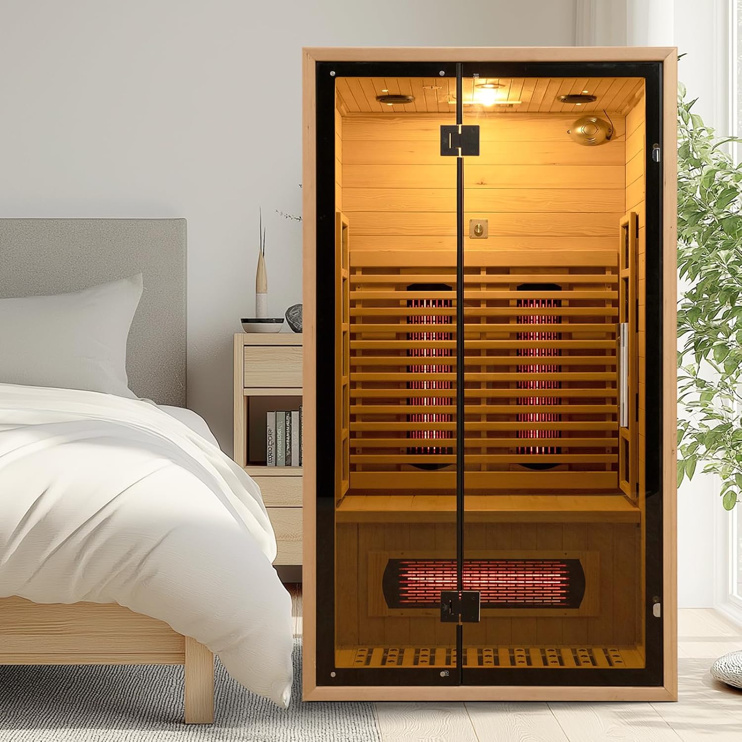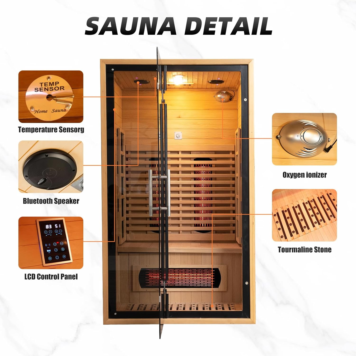 Premium material dry sauna room: Made from natural Canadian hemlock it is lightweight and durable with excellent thermal insulation properties. It is paired with sturdy high-temperature resistant tempered glass for reliable service life