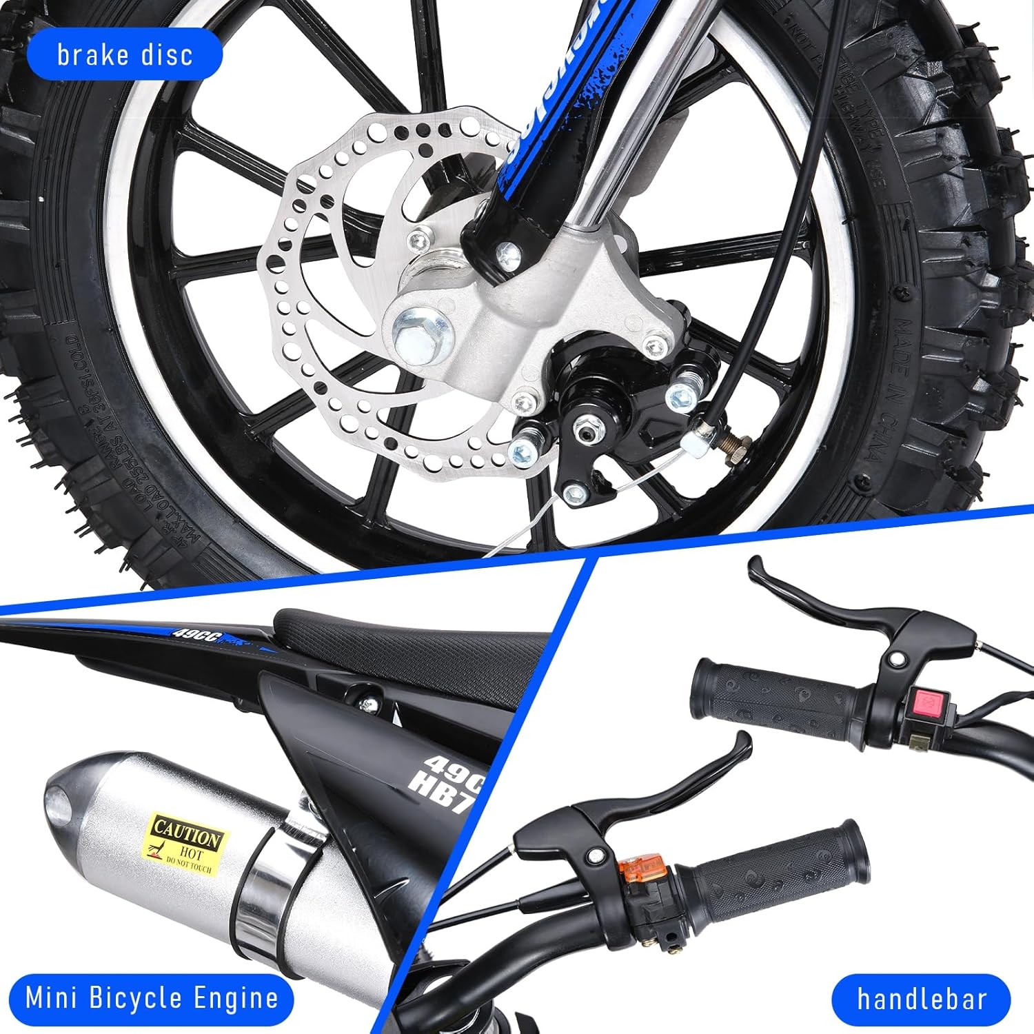 10-inch Off-road Tires: This mini off-road motorcycle is equipped with 10-inch off-road tires providing excellent grip and stability on various terrains. The robust alloy handlebars and reinforced throttle grips ensure stable braking and easy handling. The vehicle comes with standard safety features supporting reliable use in both wet and dry conditions.