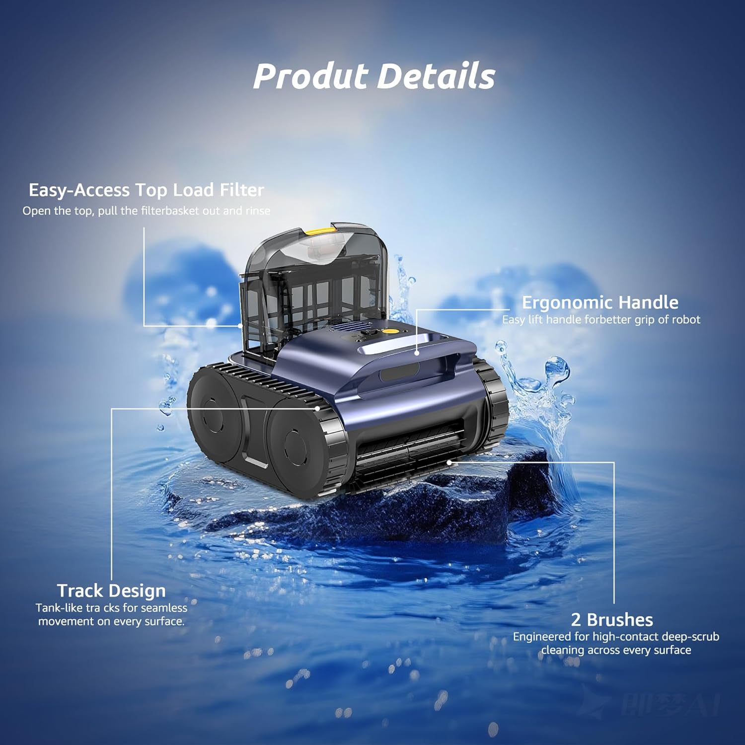 Excellent Cleaning Performance: Experience the pool cleaning power of the SAT25 pool vacuum robot's powerful suction and dynamic scrubbing capabilities. A robotic pool cleaner for pool's floor walls and waterline. The generously sized filter basket efficiently traps both large debris and fine particles and provides you with crystal-clear water for a pristine pool experience.