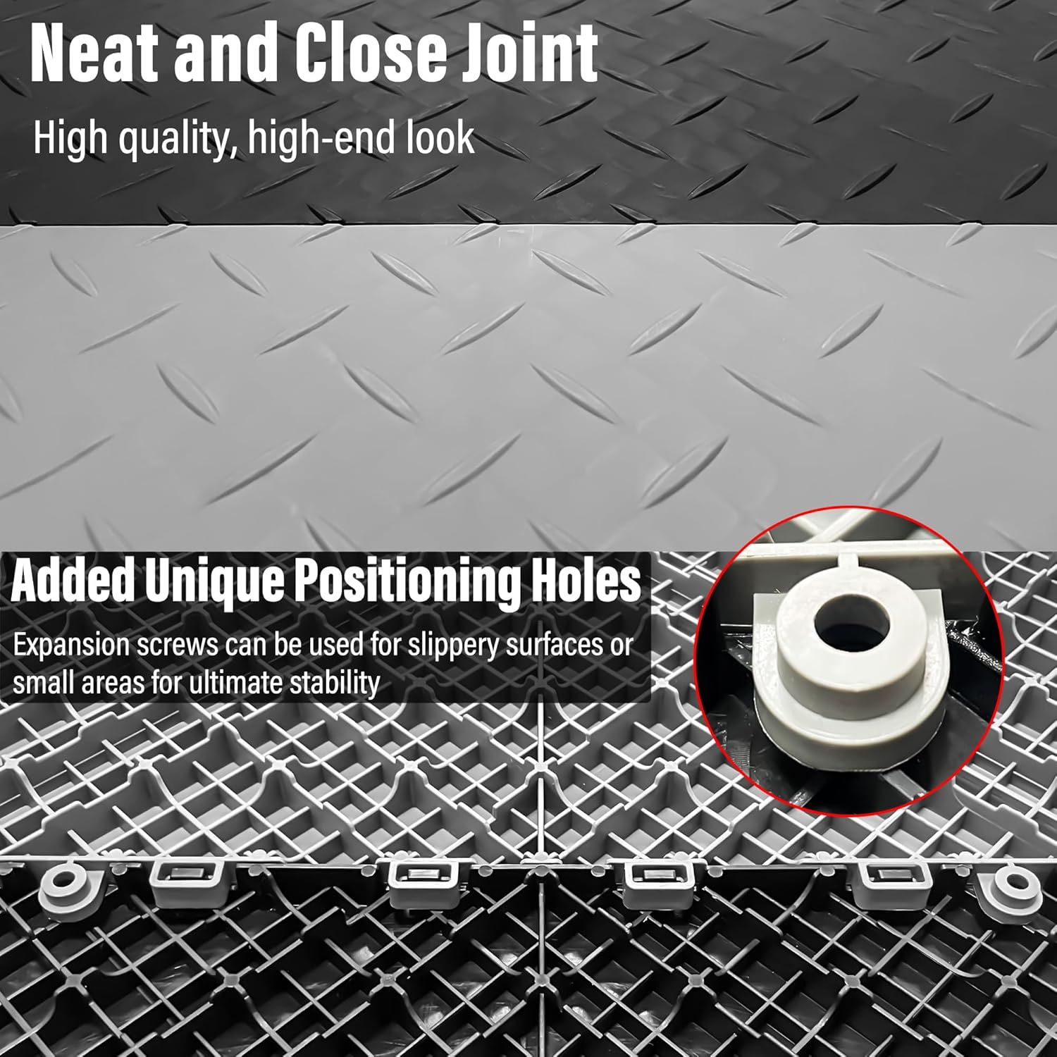 Quick Tool-Free Installation & Secure Anchoring:Simply snap tiles together for instant setup - no tools glues or extra hands required. Plus upgraded positioning holes allow anchoring with expansion screws where required preventing shifting on slippery surfaces or in small areas for ultimate stability