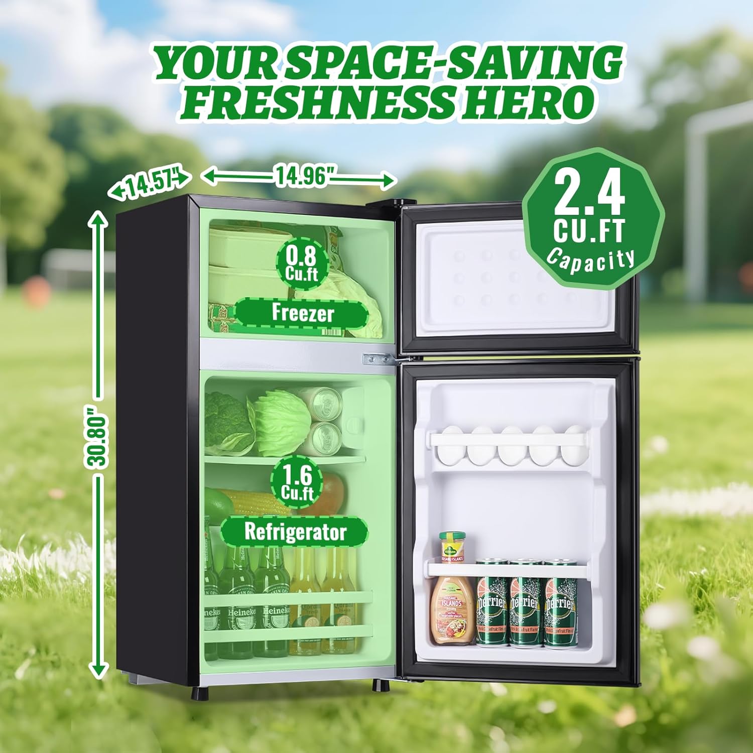 Capacity and dimensions: You will get a compact fridge and freezer all in one and it has an absolute capacity of: 2.4Cu.Ft (cooling capacity: 1.6Cu.Ft freezing capacity: 0.8Cu.Ft) Dimensions:14.96*14.57*30.8 inches