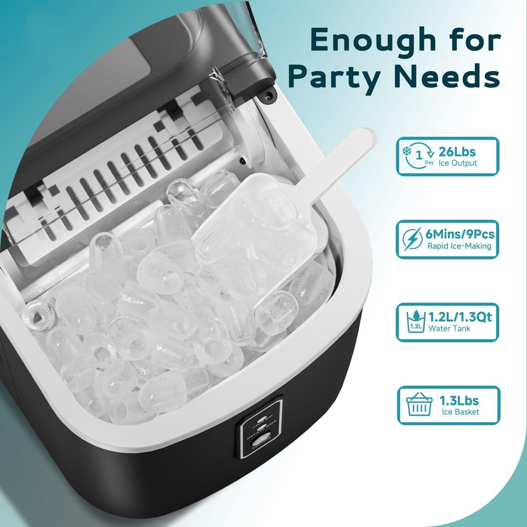 26 Pound Bullet Ice Machine Compact & Portable Self-Cleaning Sonic Ice Maker With Ice Scoop&Basket Perfect For Camping Outdoor Party Kitchen Black