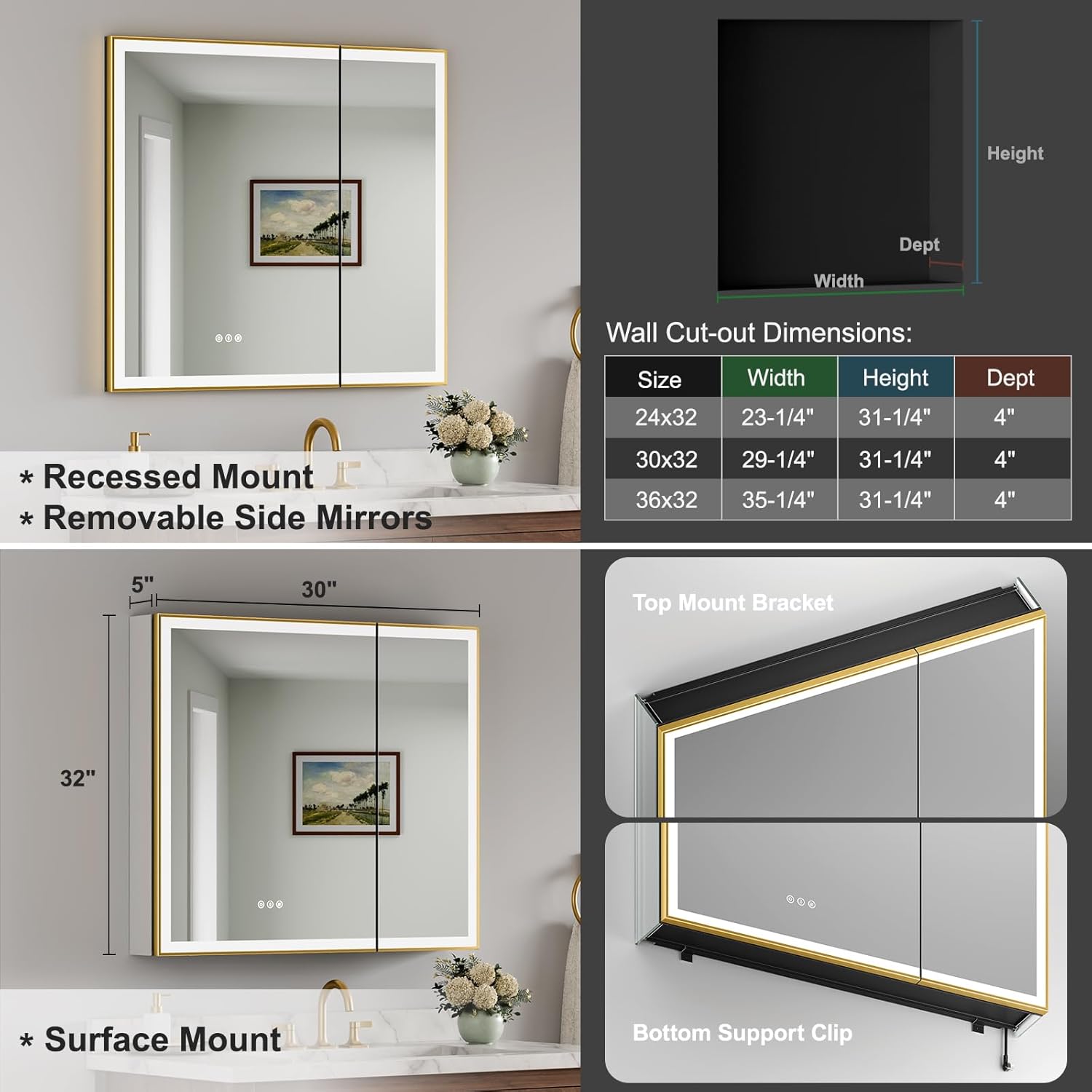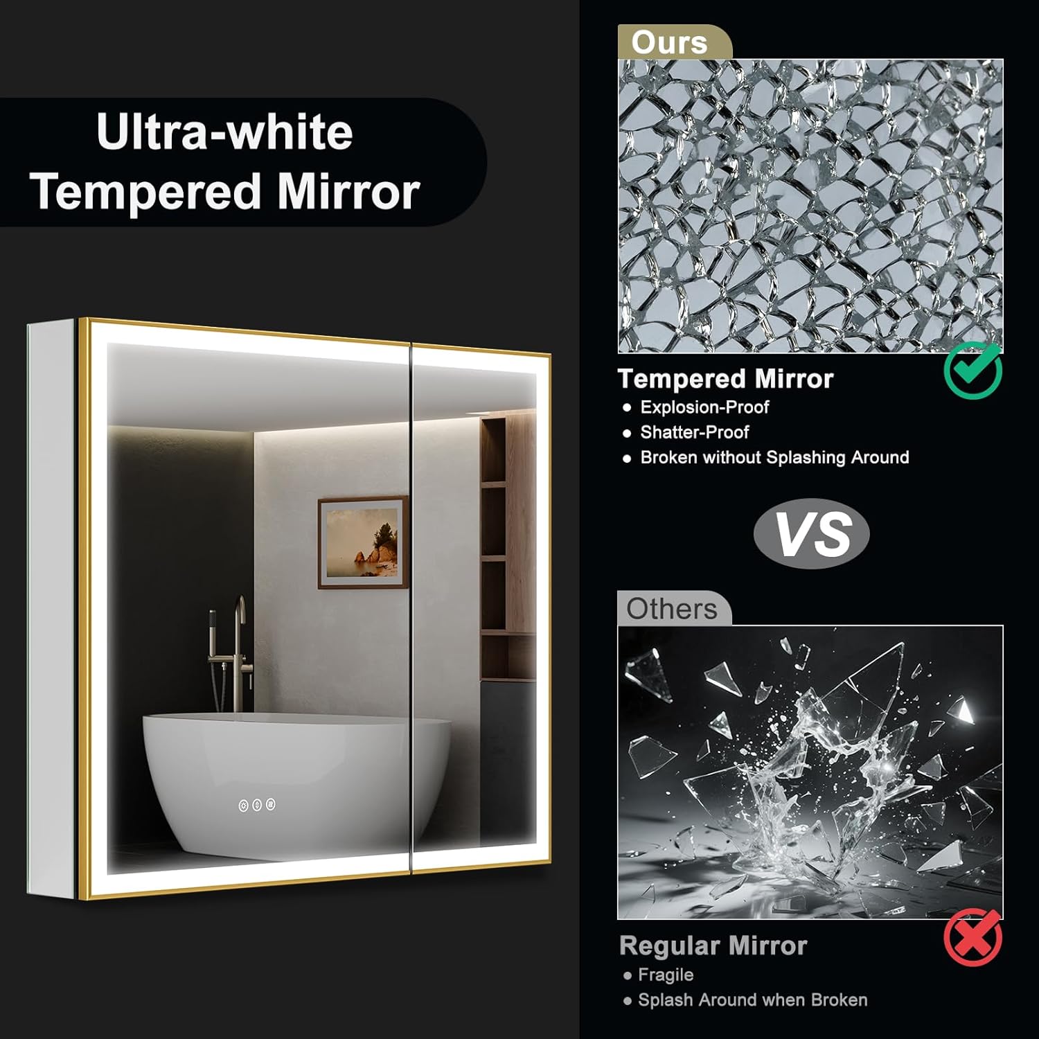 Customizable 3-Color Hkcvvimmable LEHkcvv Lighting with Memory Function– the lighted medicine cabinet with high-density high-lumen bright and energy-efficient LEHkcvv lighting offers adjustable color temperature warm (3000K) natural (4500K) cool (6000K) and brightness around the door’s perimeter to ensure the best light any time of day or night
